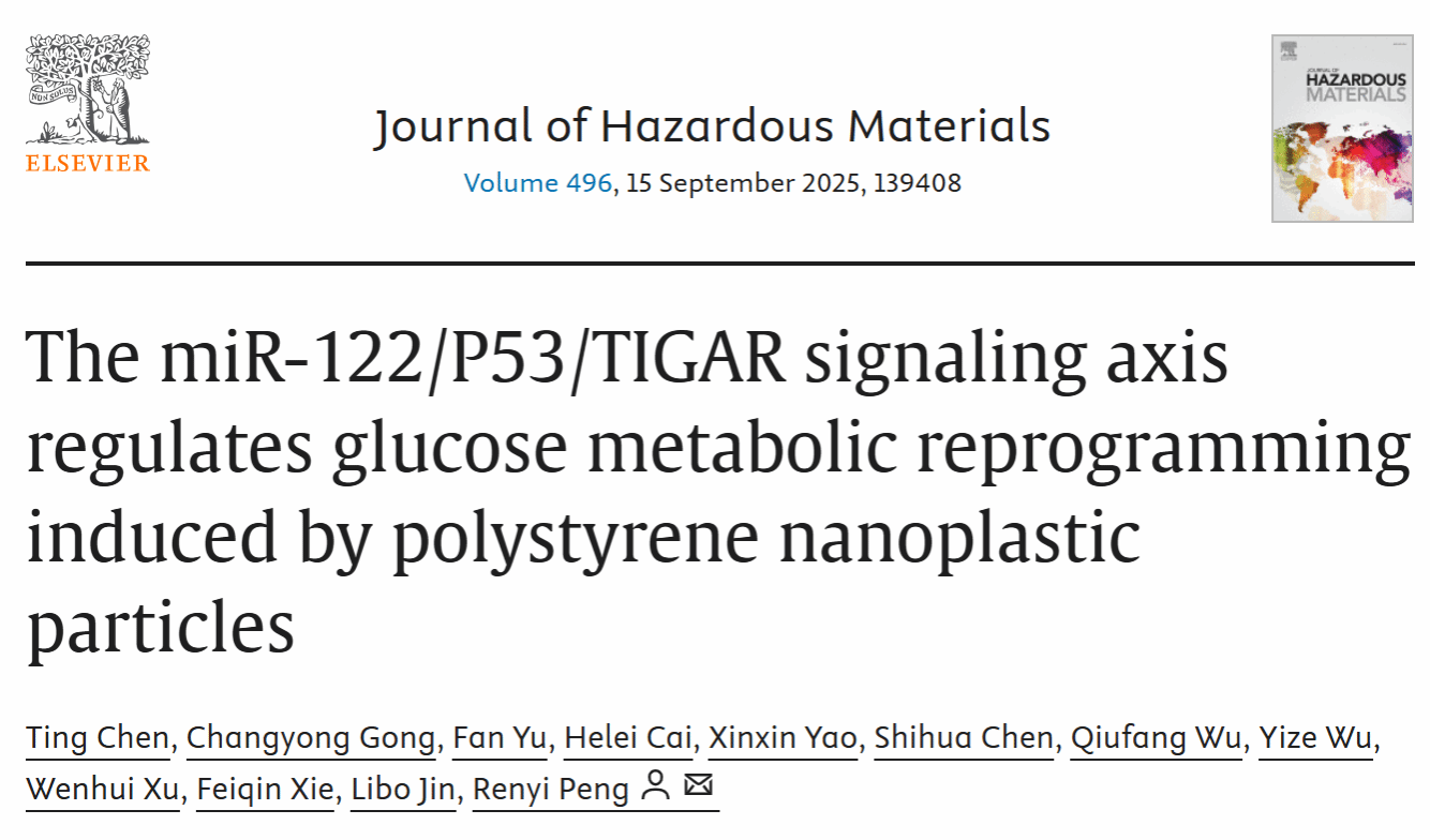 近日,杏吧 生命与环境科学学院彭仁义课题组在中科院一区期刊《Journal of Hazardous Materials》(IF=11.3)发表了题为“The miRNA-122/P53/TIGAR signaling axis regulates glucose metabolic reprogramming induced by polystyrene nanoplastic particles”最新研究。该研究聚焦聚苯乙烯纳米塑料(PS-NPs)污染这一全球性威胁,深入探究其通过靶向miRNA-122对糖代谢重编程的复杂影响机制。