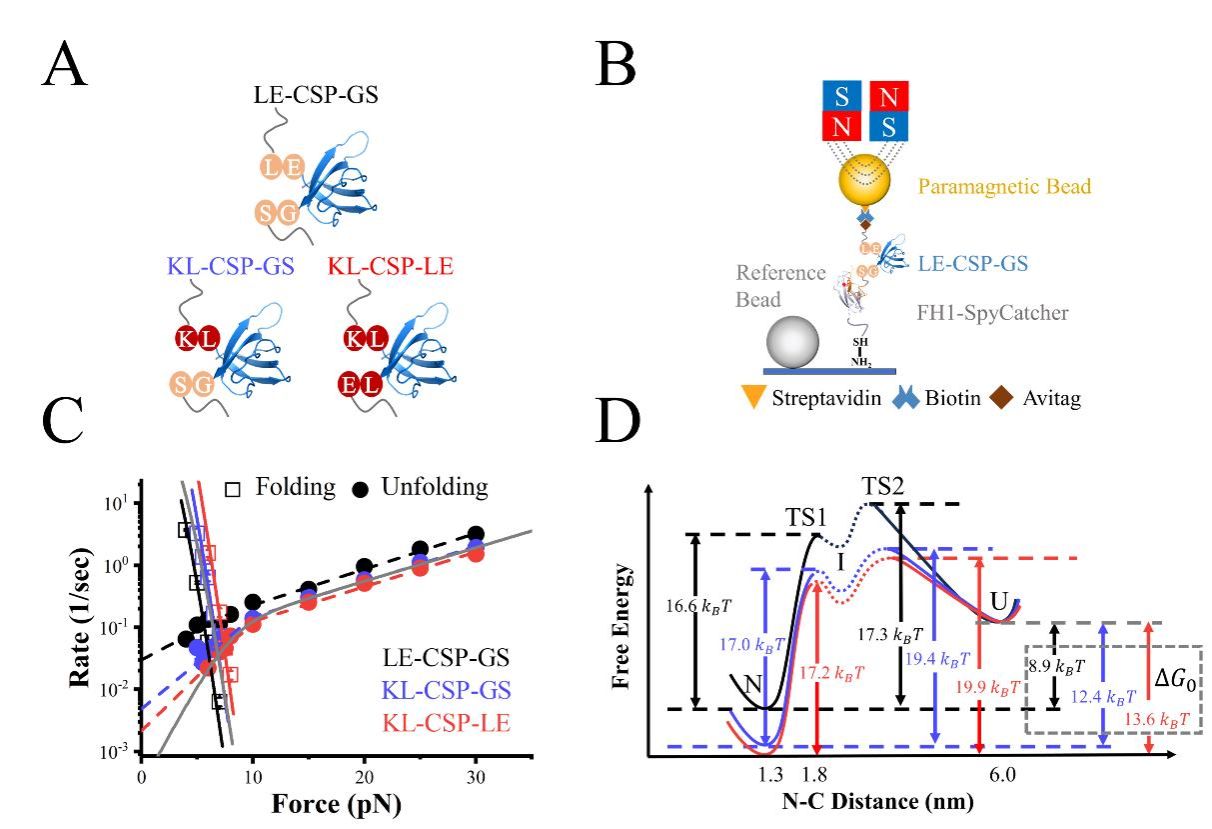 为明确末端外残基的作用,我们设计不同的酶切位点在CSP两端引入不同的氨基酸残基,创建了三种构建体(LE-CSP-GS、KL-CSP-GS、KL-CSP-LE),利用单分子磁镊技术,系统比较了CSP构建体的折叠与去折叠动力学。结果显示,LE-CSP-GS的去折叠速率常数比其他构建体快一个数量级,而其折叠速率常数下降了一个数量级以上,导致其折叠自由能降低约5 KBT。进一步通过分子动力学模拟发现,稳定性差异主要源于残基K6与E56之间形成的额外氢键。