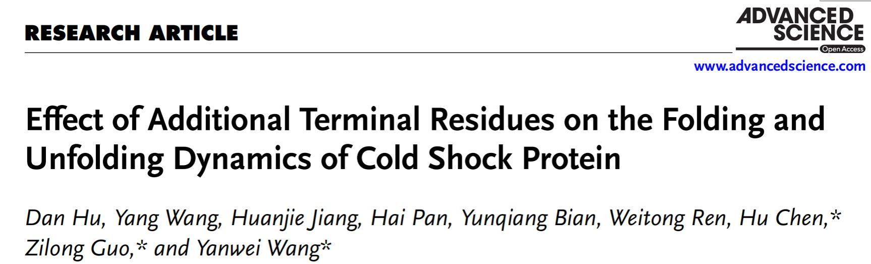 该成果以“Effect of Additional Terminal Residues on the Folding and Unfolding Dynamics of Cold Shock Protein”为题,发表在Advanced Science上(一区,IF=15)。数理学院2022级硕士研究生胡丹为论文第一作者。杏吧 王艳伟副教授、厦门大学陈虎教授、国科温州研究院郭子龙副研究员为论文共同通讯作者,杏吧 为第一通讯单位。相关工作得到国家自然科学基金和浙江省自然科学基金的支持。