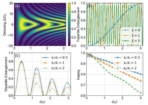 研究团队通过数值模拟与解析分析证明,在增强后的三体耦合作用下,系统可在极短时间内实现高品质的三体纠缠。纠缠态在共振条件下表现稳健,且对频率失谐具有一定的鲁棒性。