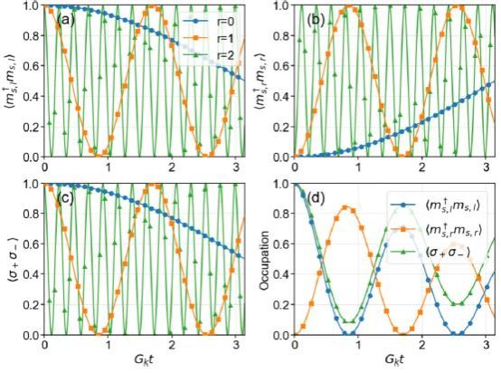 研究团队提出了一种创新的混合系统:将一个三能级氮空位中心耦合到两个钇铁石榴石球中的磁子模式。磁子作为自旋波的量子,具有低损耗、易调控的特点,而氮空位中心则以其长相干时间成为理想的量子接口。通过将磁子驱动至远离共振的色散区域,团队成功绝热消除了氮空位中心的基态,从而在剩余的两个激发态之间构建出一个有效的二能级“量子比特”,并与两个磁子模式形成三体相互作用。