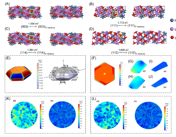 该工作通过设计具有不同的高镍正极材料去揭示晶面方向暴露比例对结构衰减的影响。从宏观上看,高镍正极材料具有较大长宽比颗粒可以有效释放由Li+离子(脱出)嵌入引起的应力,从而抑制晶间/晶内裂纹。微观上,由于(003)晶面的低氧空位形成能,这种特殊结构可以减少晶格氧的释放,从而减轻过渡金属离子的迁移并最终抑制结构衰变。此外,由于(003)晶面的应力呈涡流分布,该结构还可以有效地抑制晶内裂纹。研究结果表明了层状氧化物正极材料晶体结构设计的重要性,揭示了具有不同晶体结构比材料的结构衰减差异原因,并指出层状正极材料的结构设计应关注以下方向:(1)对于前驱体调控,应注意氨浓度/pH/流体动力学的耦合,以抑制(001)平面方向的生长;(2)选择掺杂离子时应易于吸附在(003)或(001)晶面上,以抑制[003]或[001]方向上的过度生长;(3)使用的掺杂离子能够构建较强的金属氧键,保持材料晶格的稳定性,减少晶格氧损失,从而抑制过渡金属离子迁移。