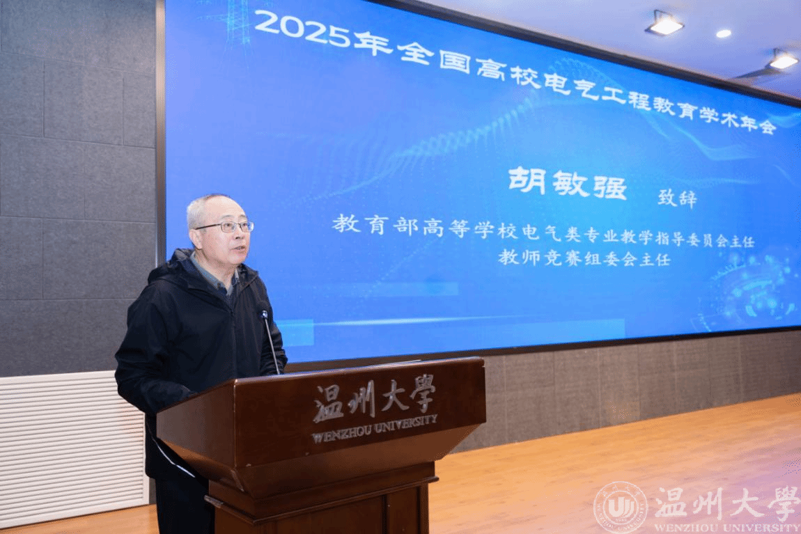 教育部高等学校电气类专业教学指导委员会主任胡敏强教授讲话。他向获奖师生表示祝贺,向竞赛专家评委、志愿者和竞赛工作组表示衷心感谢。他强调本次年会以“高等教育提质”为聚焦点,开展教育改革创新、产教融合、人工智能+高等教育等议题的学术交流,汇聚全国专家学者的智慧,共同探讨电气工程教育的创新改革与高质量发展路径。同期举办的第四届全国高校电气类专业青年教师实践教学设计创新大赛的决赛,既是展示青年教师教学创新风采的舞台,也是落实提升人才培养质量的重要交流平台。他希望参赛教师持续推动电气工程教育与产业发展深度融合,主动承担为国家能源安全、绿色转型和产业升级培养卓越人才的战略使命,为创新型国家的发展和建设作出更大贡献。