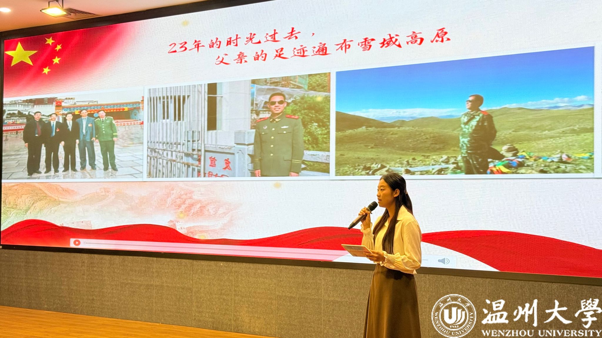 来自马克思主义学院的唐美婕同学以自身的成长经历和家庭故事为切入口,通过家庭三代人接续传递的民族深情与真实经历,诠释宏大叙事背后“铸牢中华民族共同体意识” 的深刻内涵与个体坚守。“我父母一辈在西藏卫国戍边,姑姑在边疆教书育人,我则从西藏走向更广阔的天地逐梦。这一路的篝火传承,让我体会到不同民族、不同地方的人们心手相连的磅礴力量,这正是中华民族共同体在新时代的生动写照。”唐美婕同学动情的讲述深深感动着现场师生。