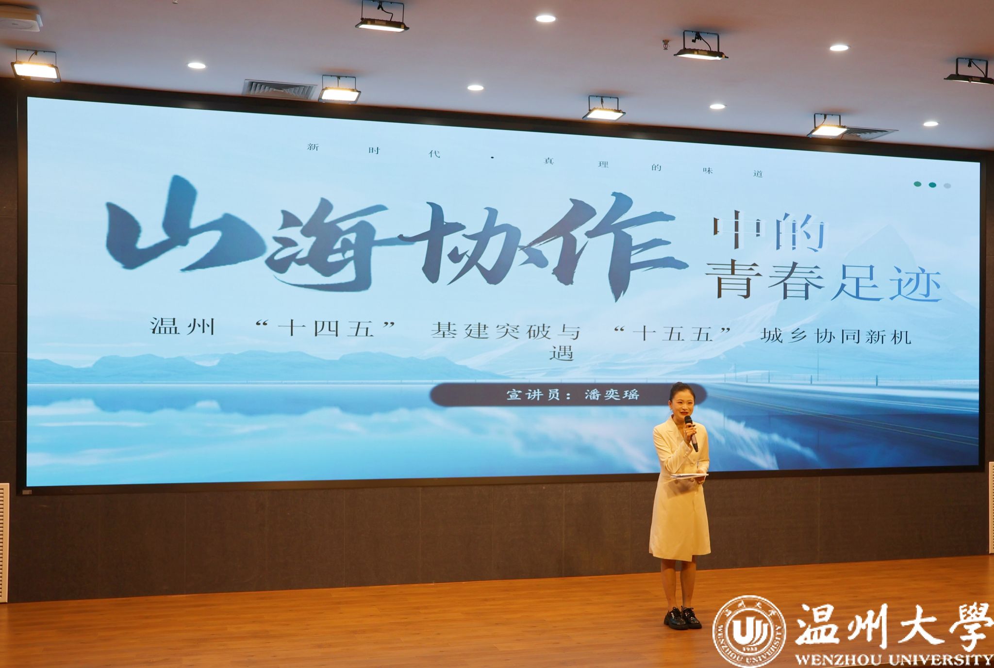 与此同时,其他宣讲员也从不同维度阐释了创新理论的丰富内涵:思政课教师安保国老师从优化话语建构、完善话语传播、推动话语融通三方面,阐述如何不断提升中华文明传播力影响力;辅导员李金伟老师通过三通特别的来电解码浙江共富密码;青年宣讲员吴想想同学以“‘侨’这三十年”为题讲述广搭连心“侨”、赓续“浙”血脉的故事;青年宣讲员柯欣妤同学以温州皮鞋的蜕变为主线,讲述政商亲清带来的企业兴旺、经济繁荣的故事;青年宣讲员潘奕瑶同学聚焦温州“十四五”基建突破与“十五五”城乡协同战略,呼吁青年将个人成长融入区域发展,以青春之力共建山海共富新格局。