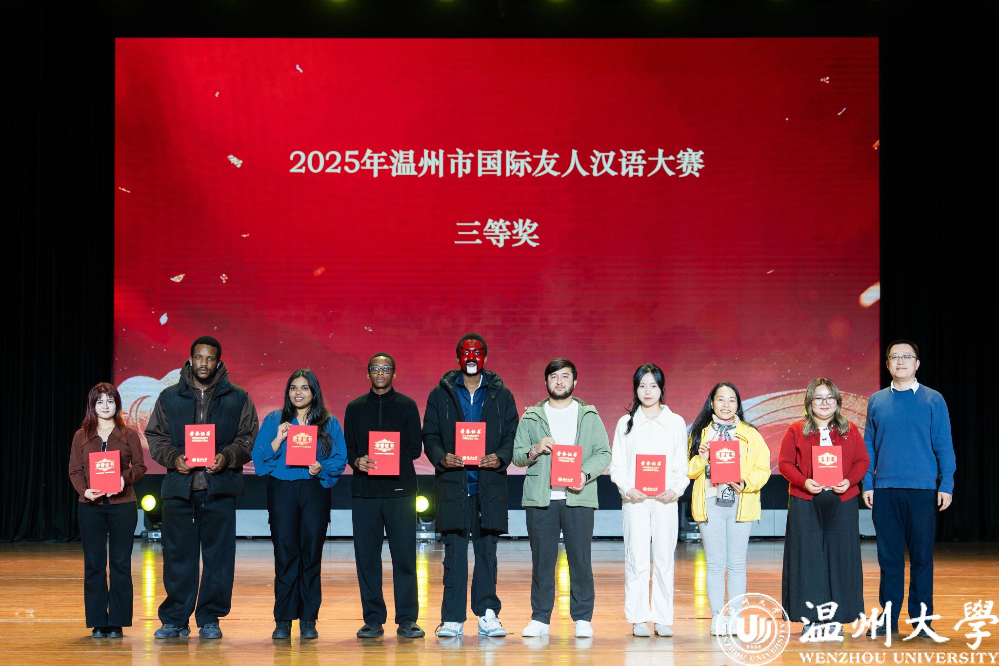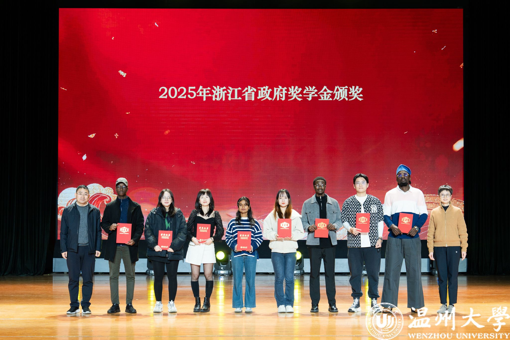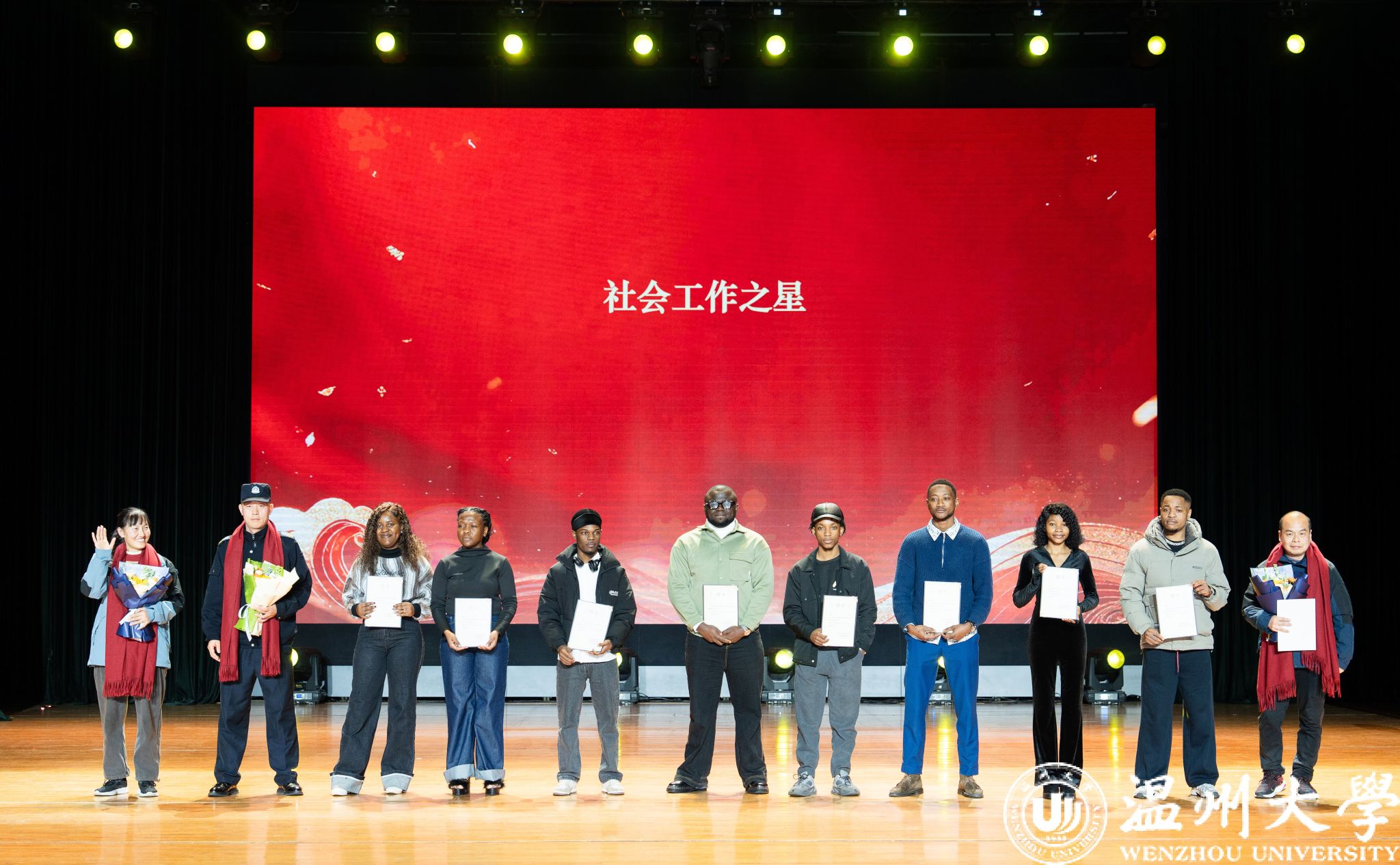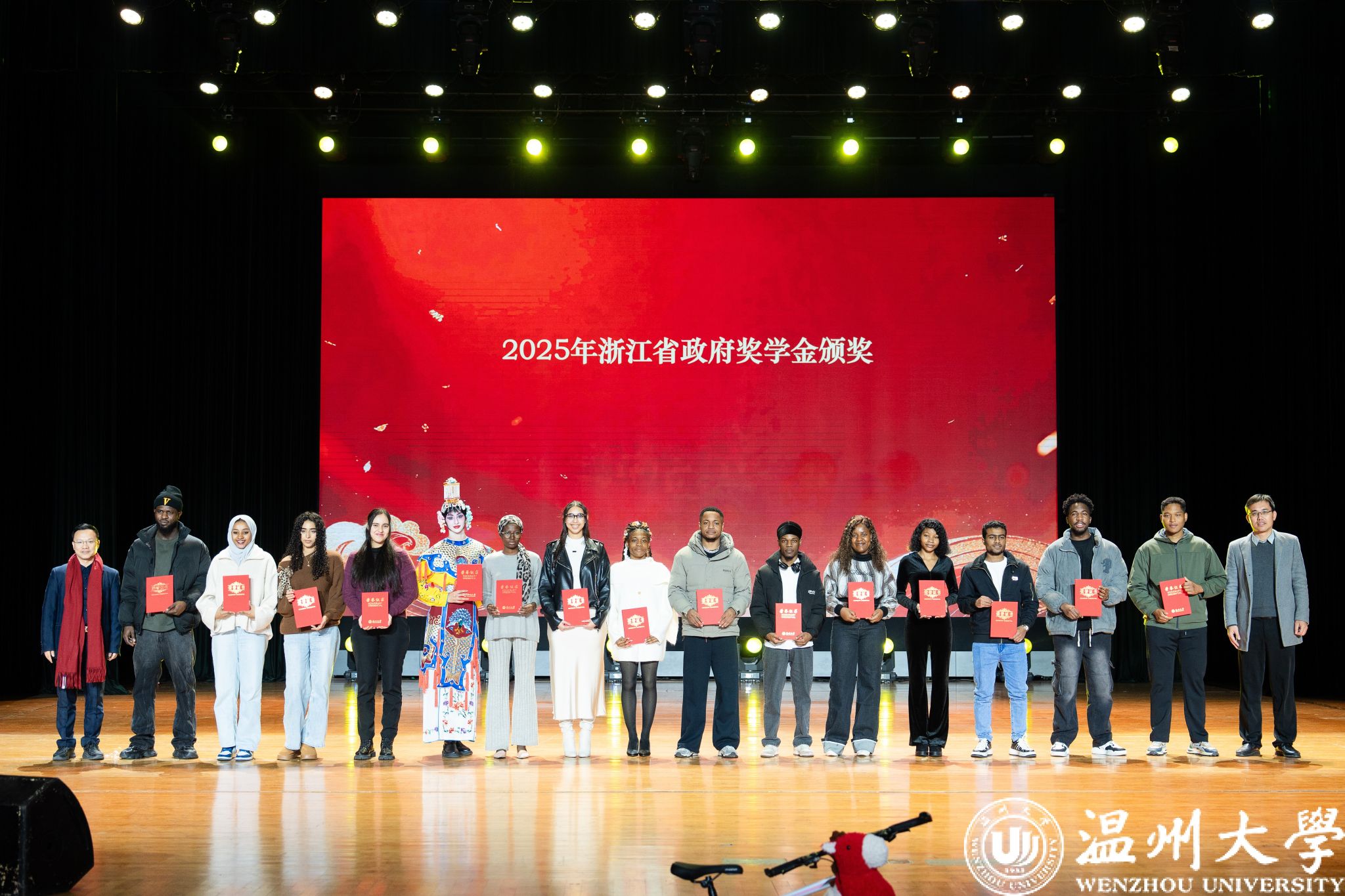 晚会特别设置了“留星闪耀——‘三全五育三服务’育人成果表彰盛典”环节。通过《华彩梨园》《杏吧 国际龙舟队赛记》《杏吧 留学生管理队伍CA风采展》等系列纪实视频,生动回顾了一年来国际学生在艺术、体育、社会工作、公益服务等领域的成长与贡献。现场依次表彰了“艺术之星”“体育之星”“公益之星”“见义勇为之星”等奖项,并为“2025年浙江省政府奖学金”及“2025温州市国际友人汉语大赛”获奖者颁奖。