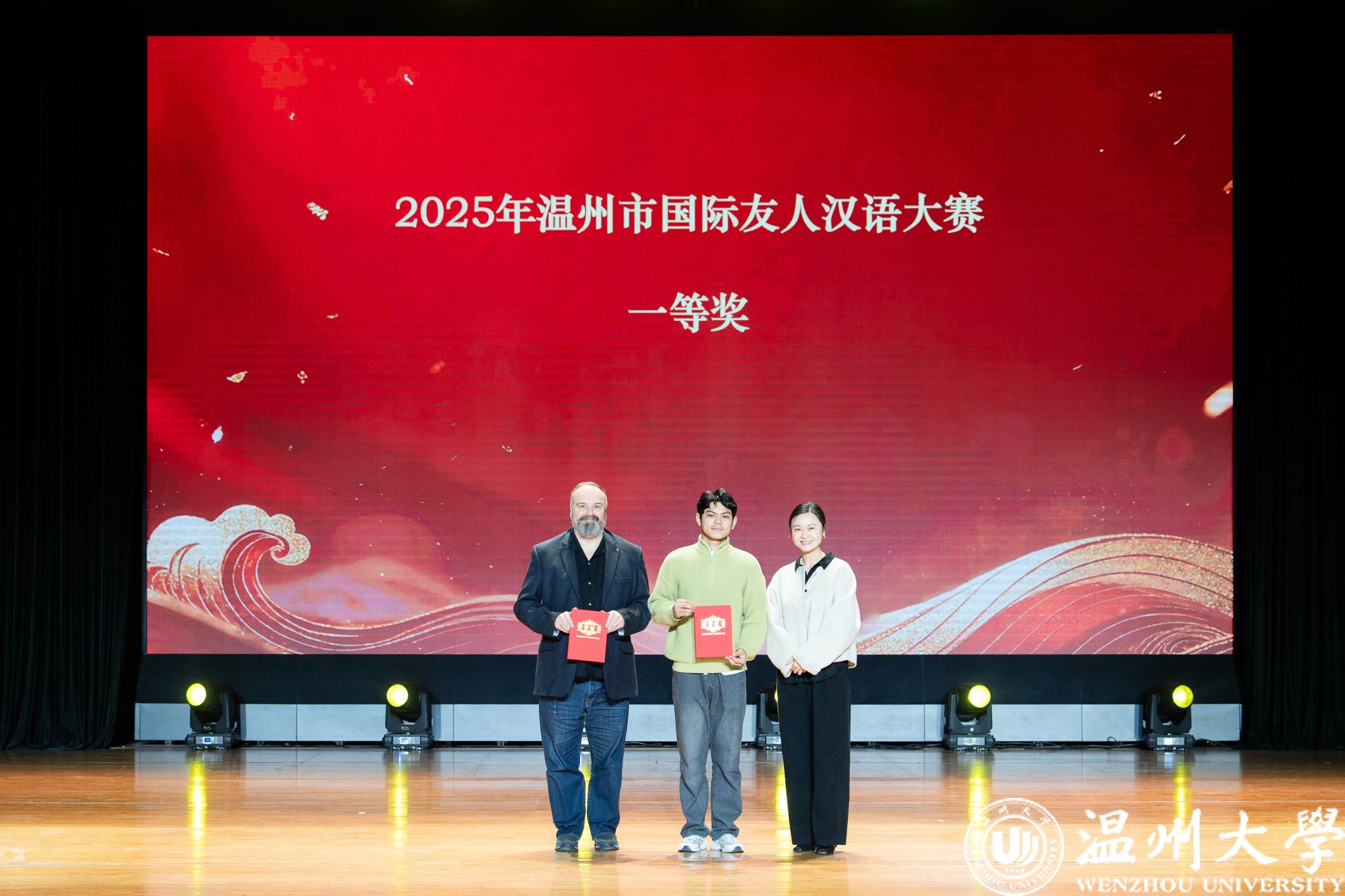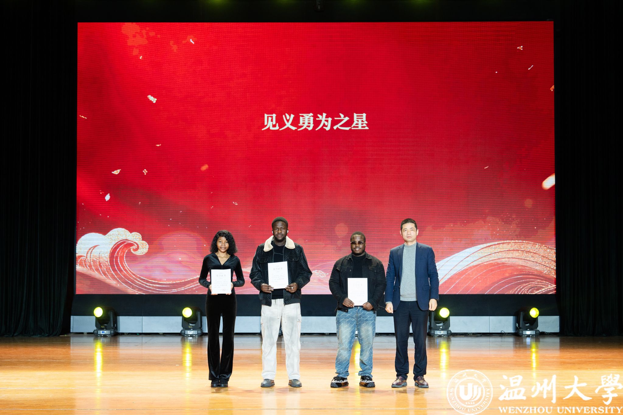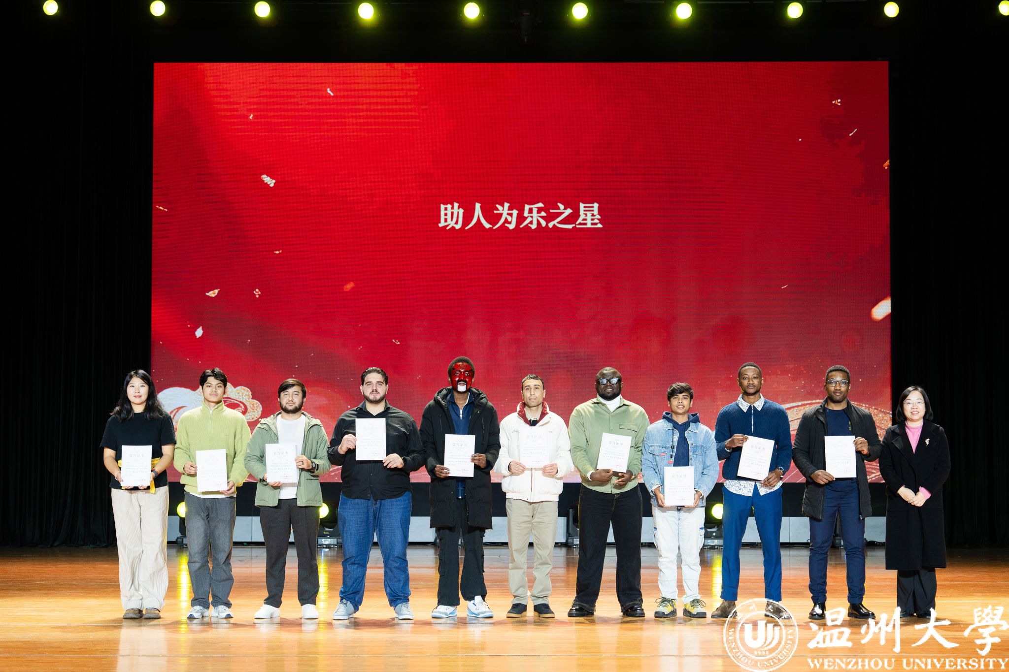 晚会特别设置了“留星闪耀——‘三全五育三服务’育人成果表彰盛典”环节。通过《华彩梨园》《杏吧 国际龙舟队赛记》《杏吧 留学生管理队伍CA风采展》等系列纪实视频,生动回顾了一年来国际学生在艺术、体育、社会工作、公益服务等领域的成长与贡献。现场依次表彰了“艺术之星”“体育之星”“公益之星”“见义勇为之星”等奖项,并为“2025年浙江省政府奖学金”及“2025温州市国际友人汉语大赛”获奖者颁奖。