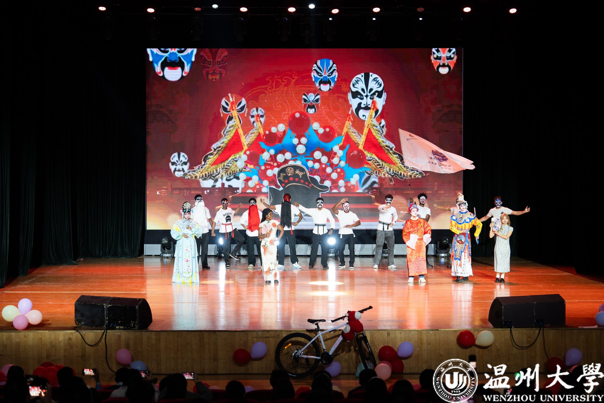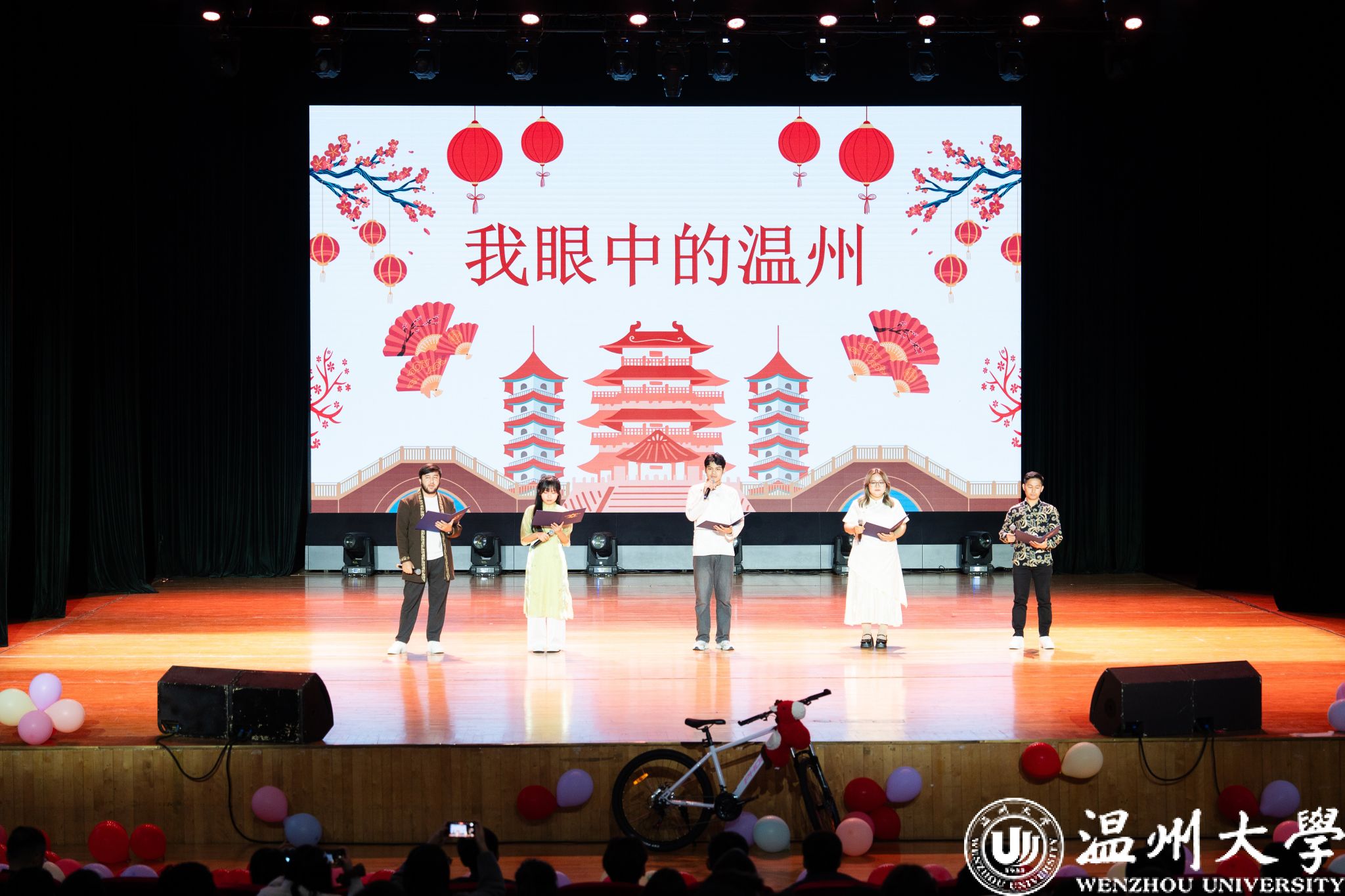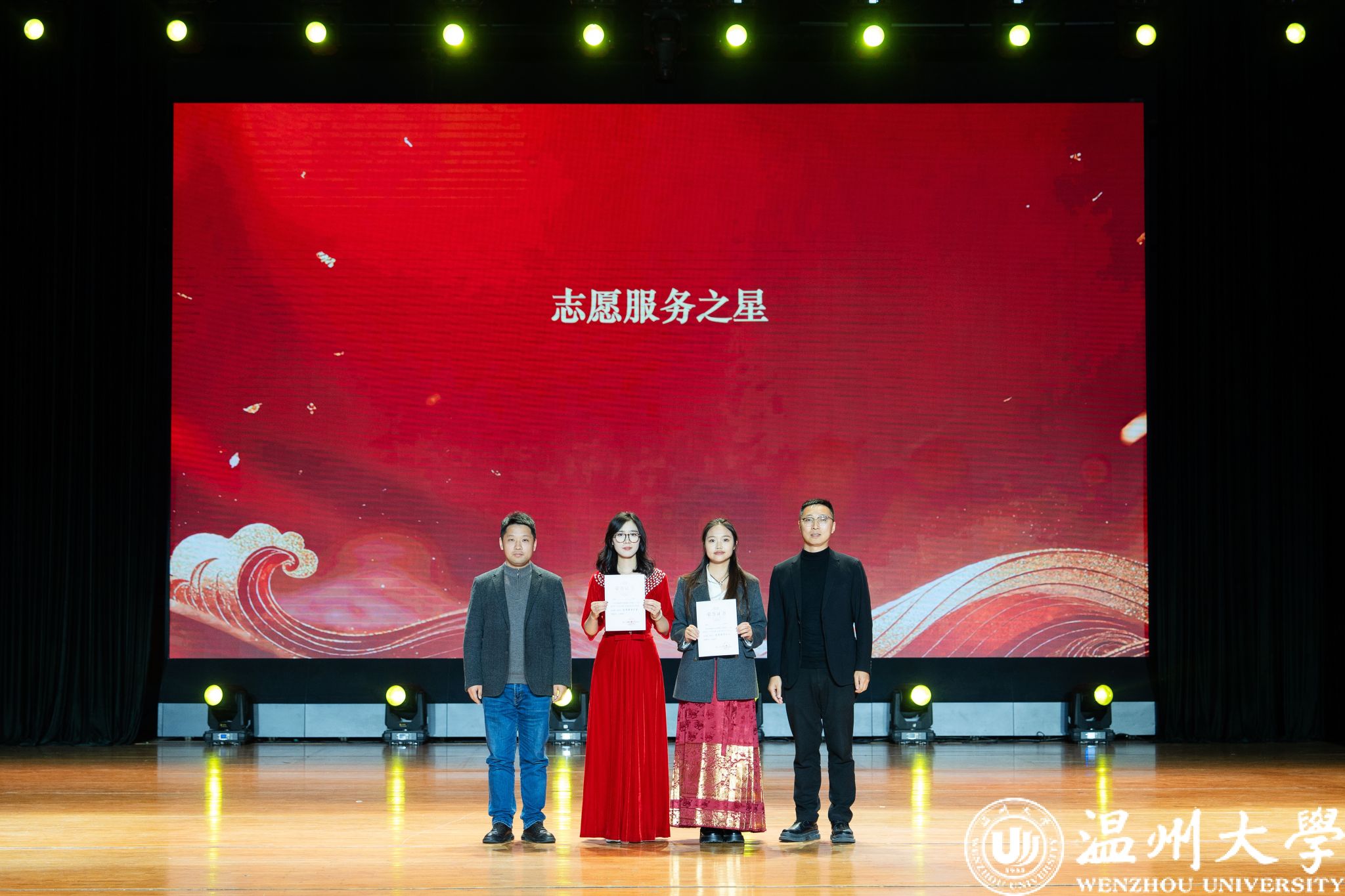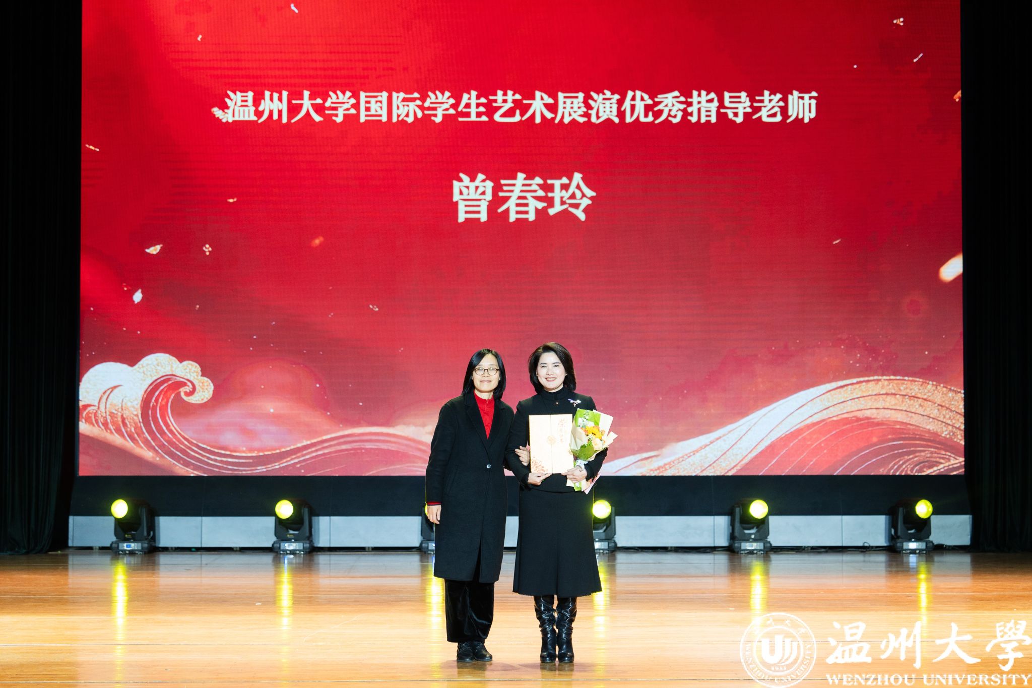 晚会特别设置了“留星闪耀——‘三全五育三服务’育人成果表彰盛典”环节。通过《华彩梨园》《杏吧 国际龙舟队赛记》《杏吧 留学生管理队伍CA风采展》等系列纪实视频,生动回顾了一年来国际学生在艺术、体育、社会工作、公益服务等领域的成长与贡献。现场依次表彰了“艺术之星”“体育之星”“公益之星”“见义勇为之星”等奖项,并为“2025年浙江省政府奖学金”及“2025温州市国际友人汉语大赛”获奖者颁奖。