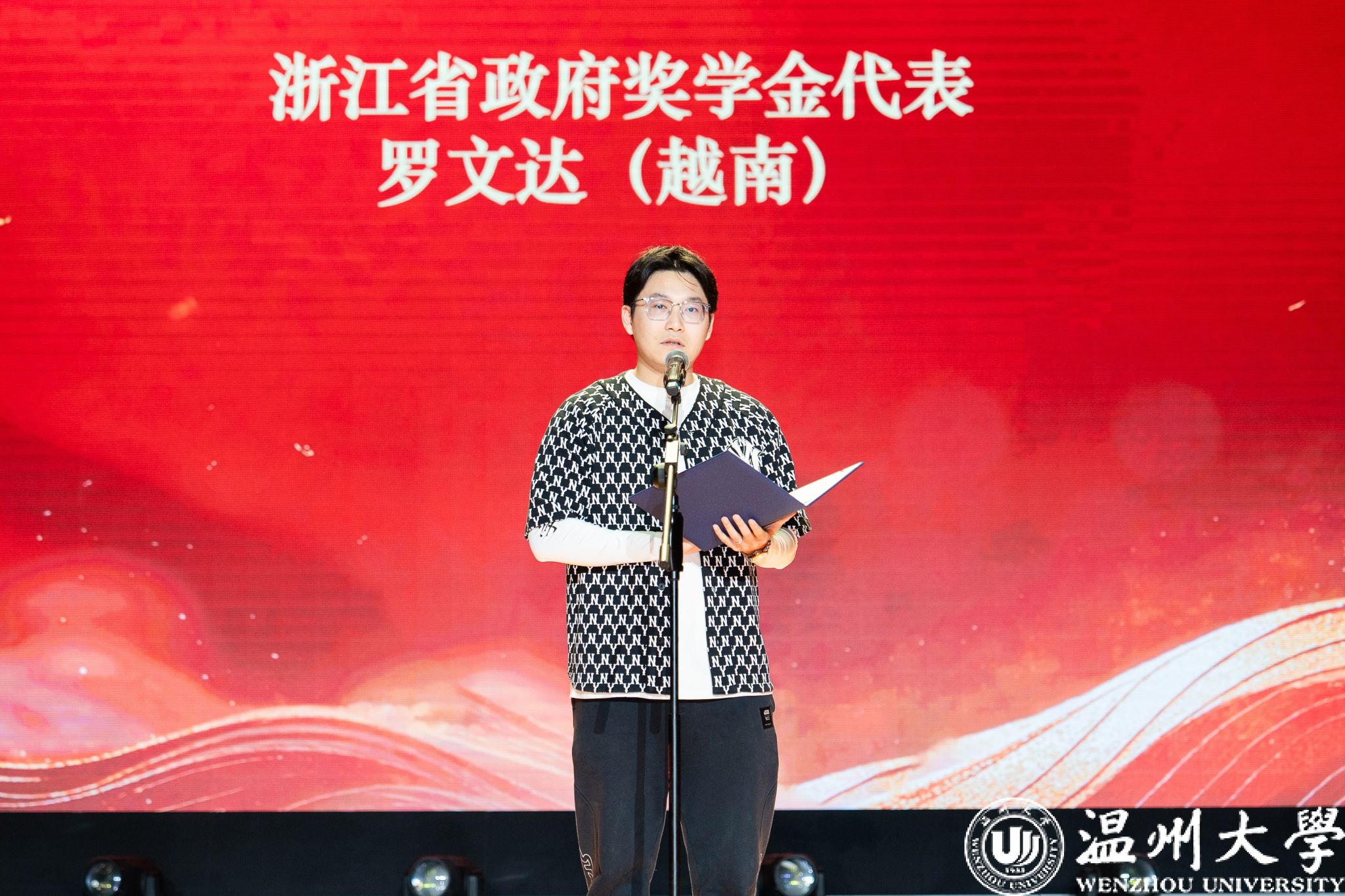 其中,“社会工作之星”的颁奖格外温情。学院特别邀请宿管阿姨和保安大叔为获奖学生颁奖。当阿姨递过证书,质朴地说:“看到同学们平安开心,我们就最高兴。祝大家新年快乐!”现场顿时响起经久不息的掌声——这份来自“身边守护者”的祝福,让这份荣誉更加温暖而有力量。随后,浙江省政府奖学金获奖代表、越南籍学生罗文达上台分享,他以流利中文说道:“学习汉语为我打开了认识中国的一扇窗。”言语间满是对学校培养的感激与对中华文化的认同。