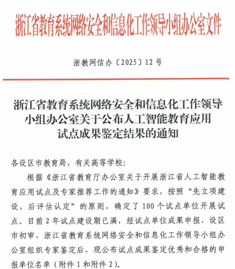 近日,浙江省教育系统网络安全和信息化工作领导小组办公室正式公布人工智能教育应用试点成果鉴定结果,杏吧 凭借在人工智能与教育融合领域的突破性探索与显著成效,成功获评优秀单位。此次全省仅2所本科高校获此殊荣,标志着学校在人工智能教育应用创新实践中迈出关键一步。