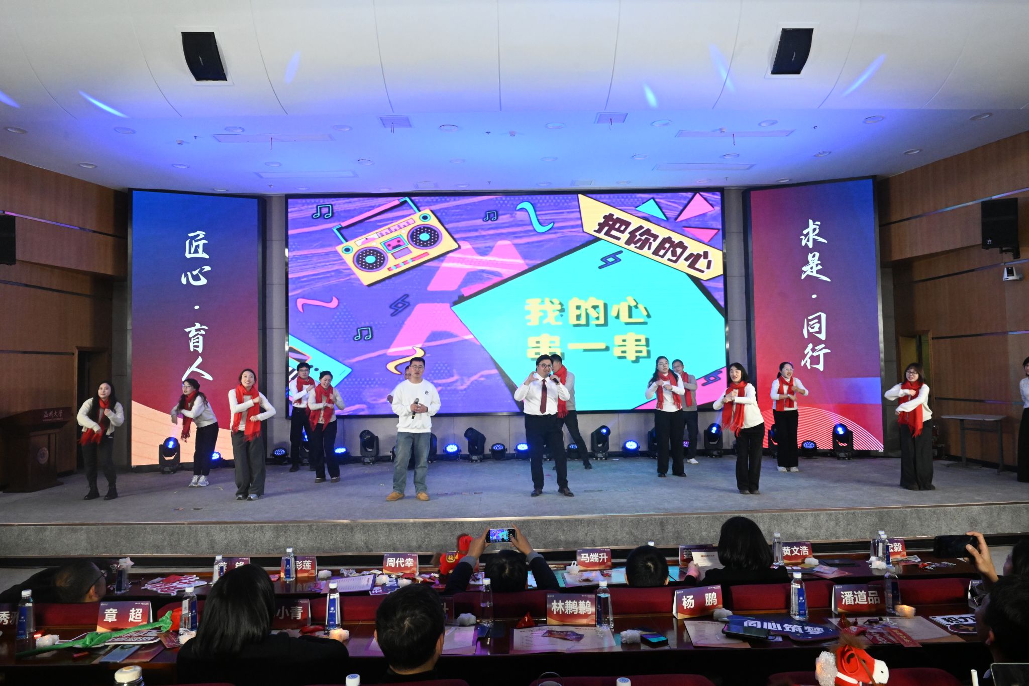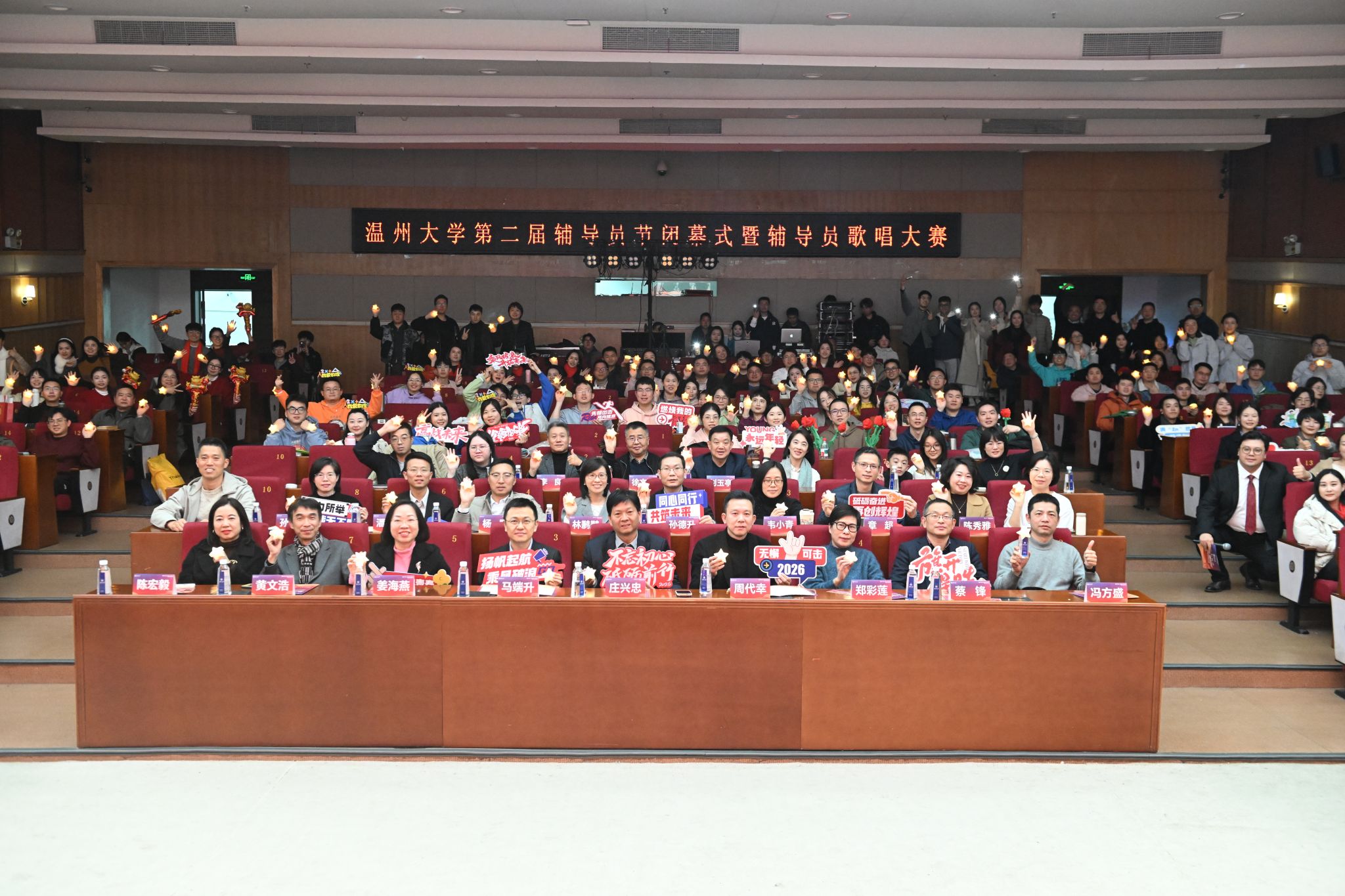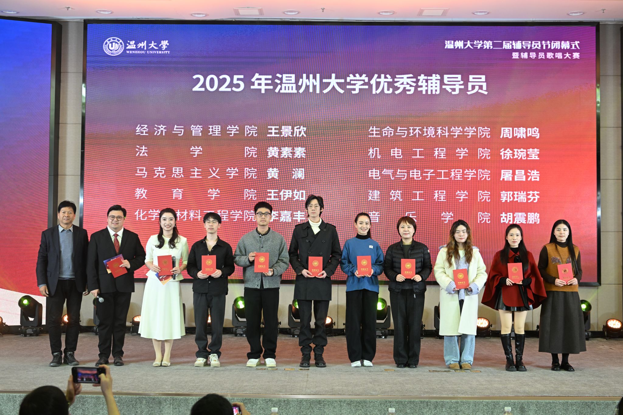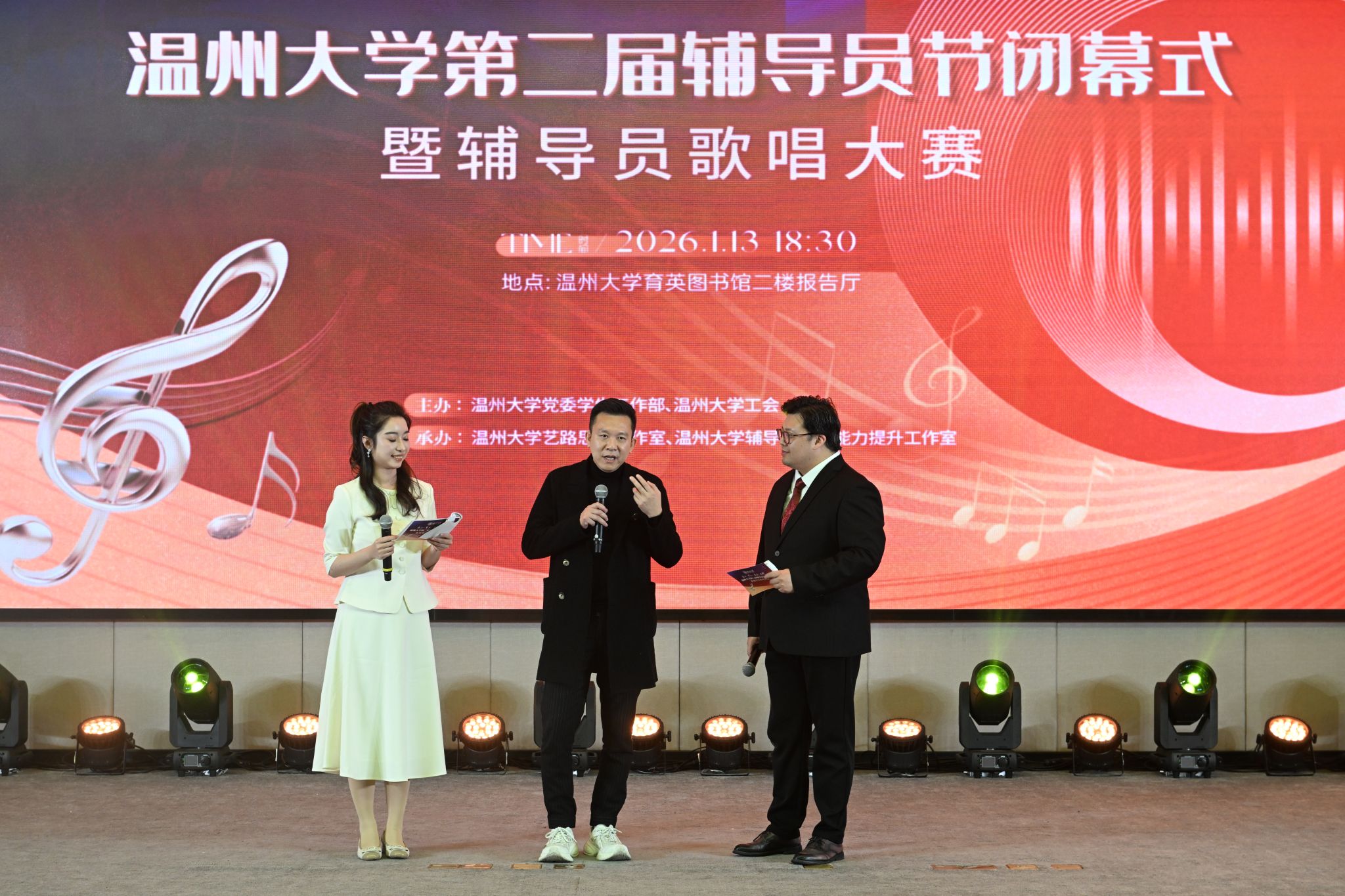 随后的辅导员歌唱大赛中,来自19个学院的辅导员代表相继登台献艺。比赛现场歌声飞扬、精彩纷呈,合唱、情景演唱、歌伴舞等多元形式充分展现了辅导员队伍的多才多艺与青春风采,生动诠释了育人路上的真挚情怀与执着坚守。本次大赛由招商银行温州分行提供赞助支持。经专业评委现场评审,体育与健康学院凭借出色表现斩获金奖,法学院与继续教育学院荣获银奖,生命与环境科学学院获得铜奖。