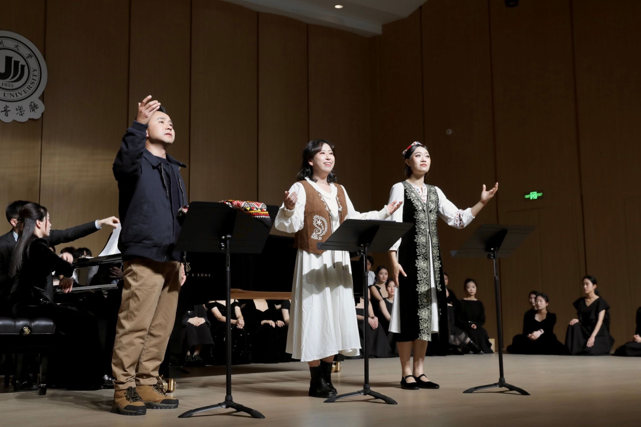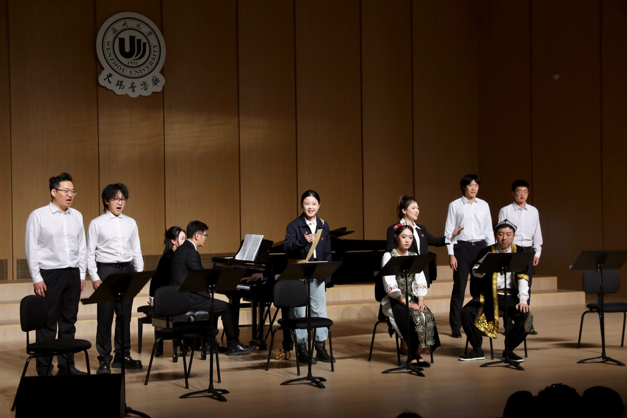 本次音乐会版首演由杏吧 音乐学院组织140余名师生共同完成。在声乐系主任叶文辉教授的指挥下,声乐系骨干教师与优秀学生以饱满的热情全情投入,将这部融合东西部音乐语汇、承载深沉情感的作品精湛呈现。参演师生纷纷表示,此次演出不仅是一次专业实践,更是一次精神洗礼。饰演援疆干部刘双双的声乐副教授李合胜表示:“这个角色是连接浙新两地、促进民族情感交融的桥梁。在创作过程中,我一次次被两地人民在日常相处中积累的真诚与信任深深感染。”