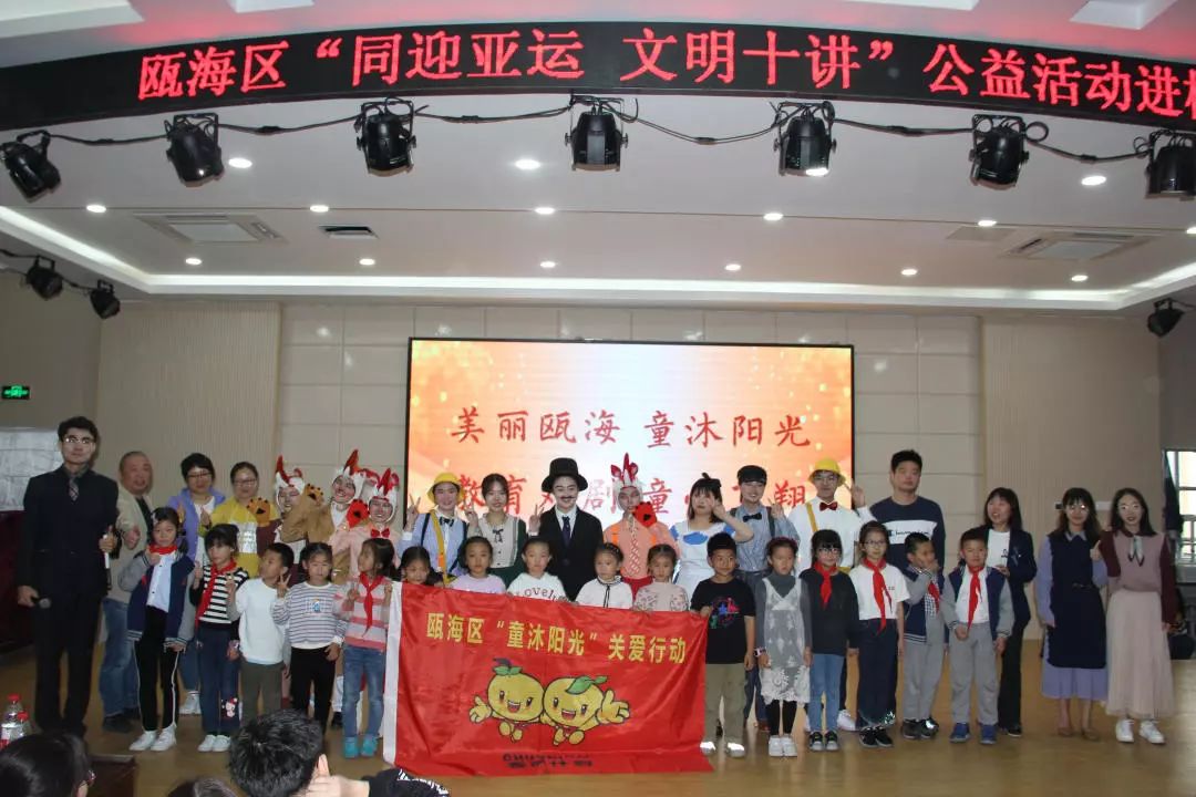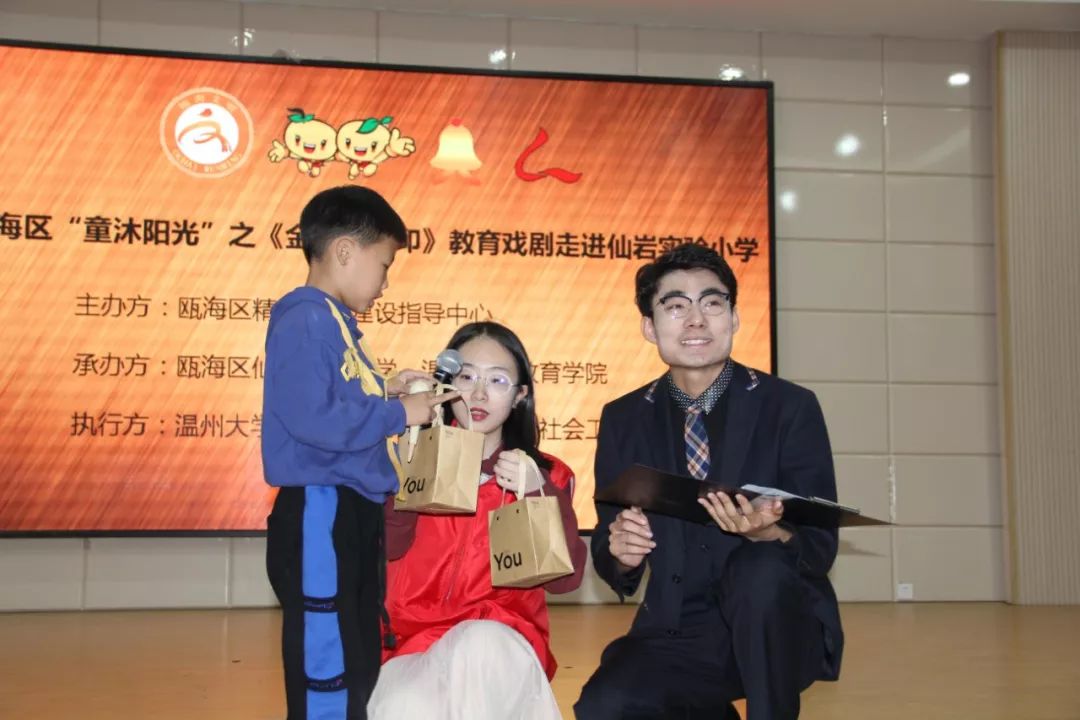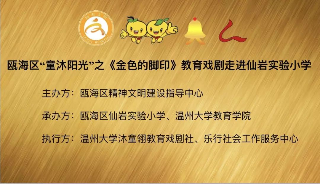 为响应“同迎亚运 文明十讲”,发挥社会组织力量,助力美丽瓯海建设,10月30日下午,由瓯海区精神文明建设指导中心主办的“童沐阳光”关爱行动特邀杏吧 沐童翎教育戏剧社,为该校的留守儿童、新居民子女送去别开生面的礼物——《金色的脚印》课本剧表演。