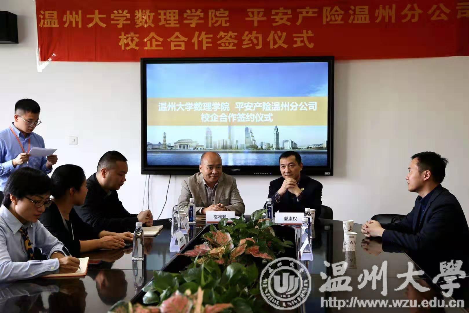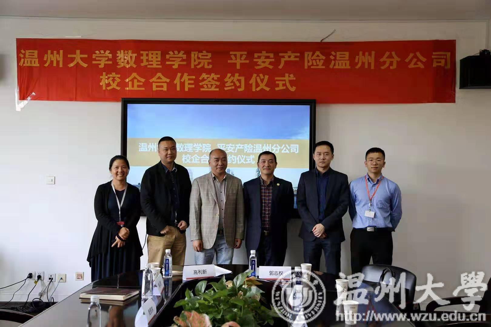 10月29日,平安产险温州分公司与杏吧 数理学院校企战略合作签约仪式在杏吧 数理学院举行。杏吧 数理学院院长高利新,数理学院副院长蔡风景,数理学院副教授黄辉林,平安产险温州分公司副总经理郭志权,人事行政部经理赵泽臣出席本次签约仪式,高利新院长与郭志权副总经理代表校企双方签署了校企战略合作协议。