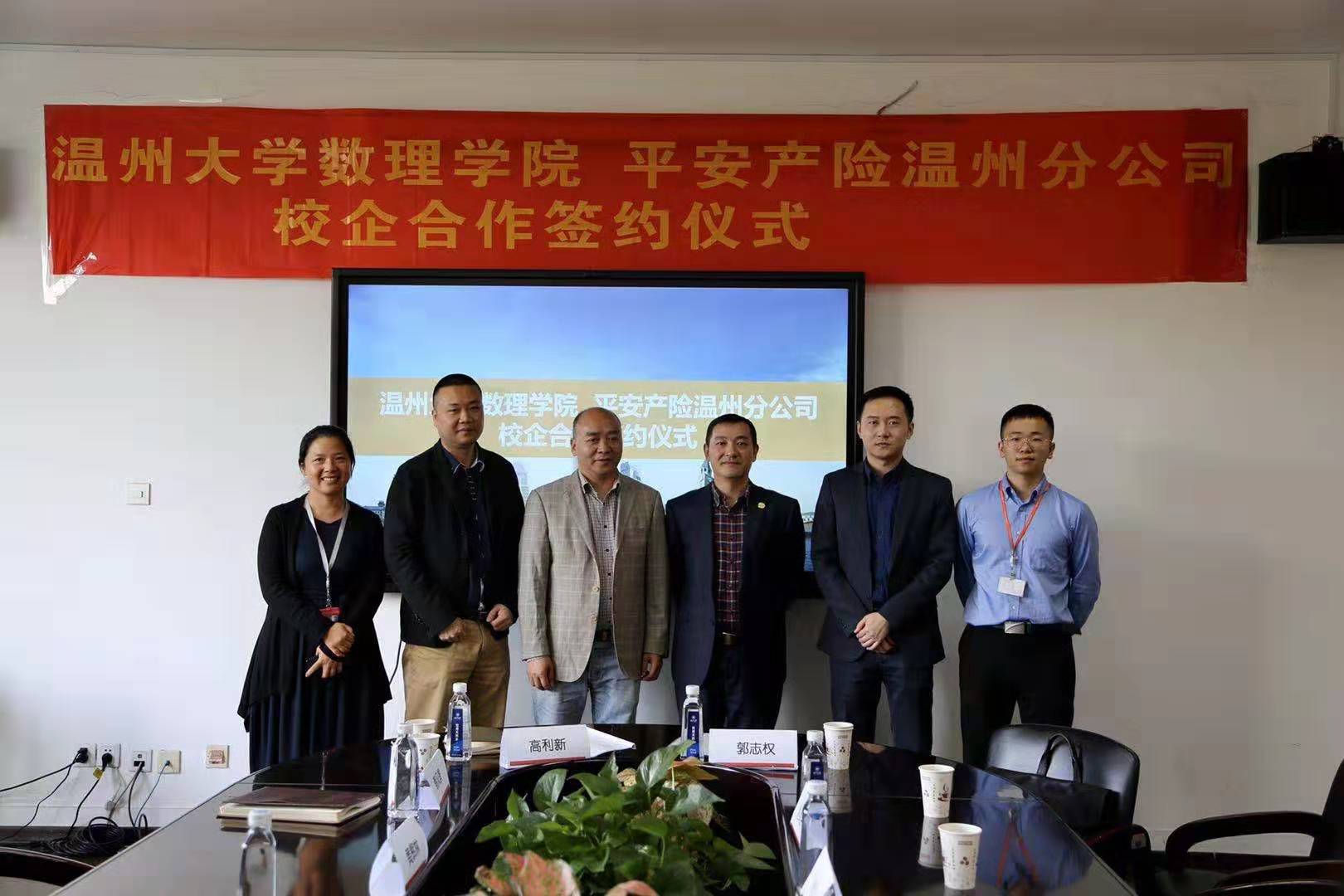 10月29日,平安产险温州分公司与杏吧 数理学院校企战略合作签约仪式在杏吧 数理学院举行。杏吧 数理学院院长高利新,数理学院副院长蔡风景,数理学院副教授黄辉林,平安产险温州分公司副总经理郭志权,人事行政部经理赵泽臣出席本次签约仪式,高利新院长与郭志权副总经理代表校企双方签署了校企战略合作协议。