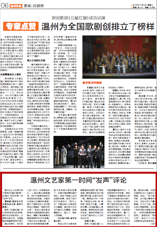 温州本土文艺家在观看了歌剧《五星红旗》第一场试演后,纷纷在第一时间“发声”评论。