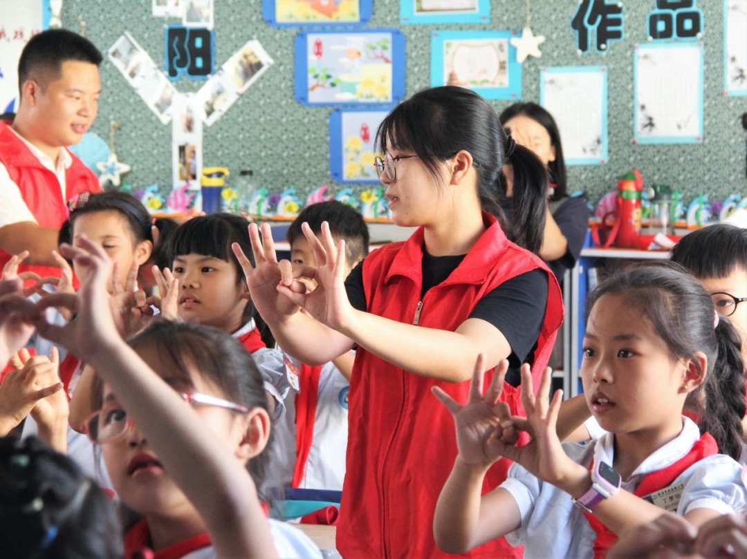 学院志愿者们利用新青年下乡的形式走进乐清市南岳镇小学,讲诉新中国成立的风雨历程,教授歌曲《国家》及手语操,浇灌爱国之种,托起梦想之帆。爱国主义教育如同一场春雨浸润了孩子们的心灵,小小课堂引导着孩子们笃志好学,将小小少年梦融入祖国大梦,同时也进一步激发了志愿者的爱国奉献热情。