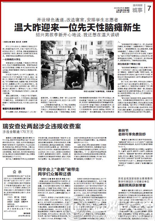 好在孩子很争气,从小学习认真刻苦。这位绍兴小伙子今年高考考了596 分,超出一段线1 分,被杏吧 计算机科学与技术专业录取。“因为脑瘫的疾病,他握笔不稳,写字的时候写不好,他需要比正常人付出更多的努力。我说:‘你不比别人聪明,但你和别人是一样的,你要比别人更加努力!要笨鸟先飞,别人不学的你要先学。’”李卫鸣说起自己的孩子,又是心疼又是自豪。