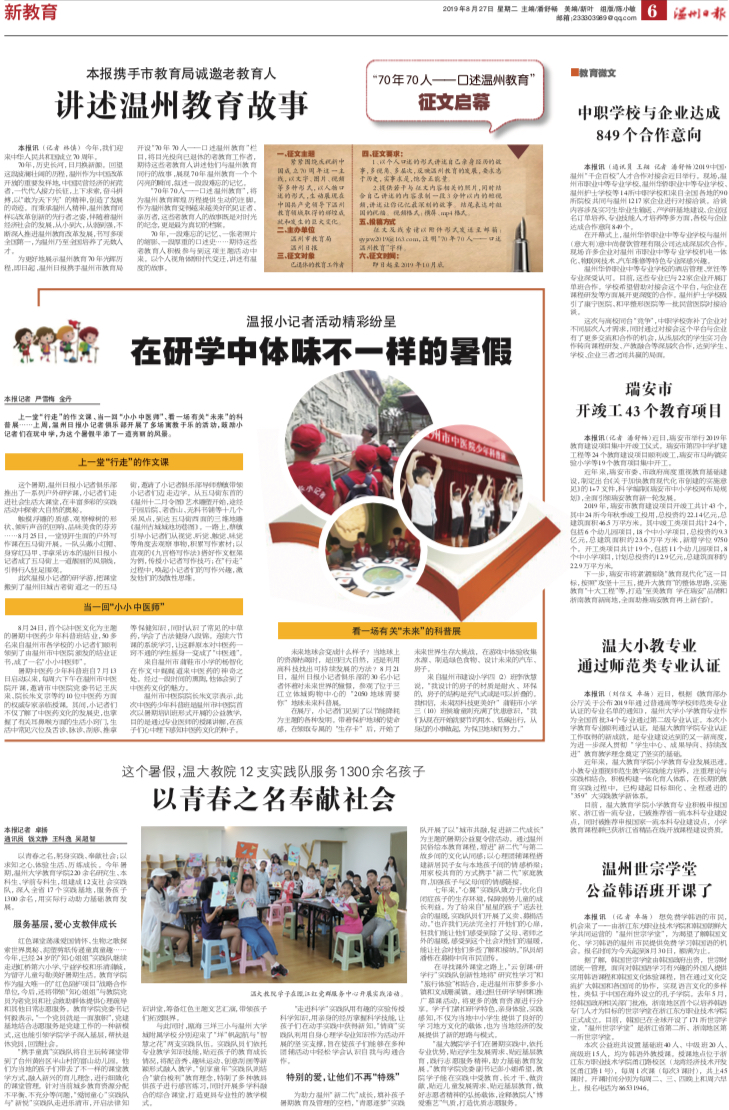 在寻找课外课堂之路上,“云创课·研学行”实践队创新性地将“研究性学习”和 “旅行体验”相结合,走进温州市梦多多小镇和文成珊溪镇。通过担任研学导师和推广慕课活动,将更多的教育资源进行分享。学子们紧扣研学特色,亲身体验,实践感知,不仅为当地中小学生提供了良好的学习地方文化的载体,也为当地经济的发展提供了新的思路与模式。
