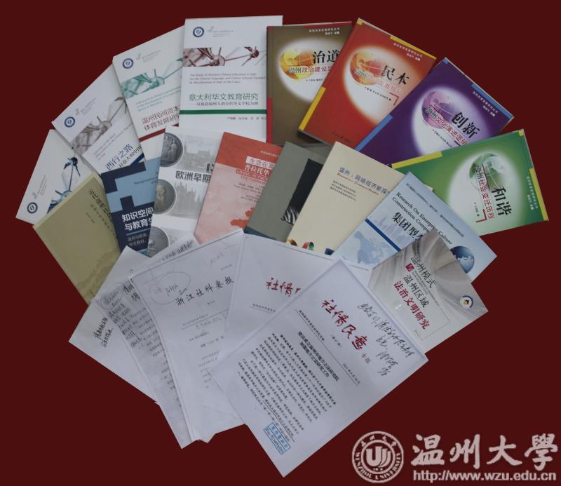 在世界温州人中心里面,有几个书架,里面摆满了世界温州人研究中心专家们的研究成果和学术著作。里面涉及到温州人移民、温商产生和发展、海外温州人和温州本地关系研究、温州模式、温州地方法治建设、温州民企与国际交流等方方面面的问题。