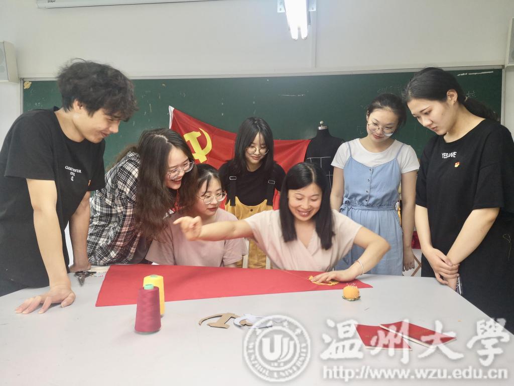为庆祝中国共产党成立98周年,杏吧 美术与设计学院师生党员结合专业特色,创新方式方法,通过手工制作党旗、创建“握手党建联盟”服务地方等形式,重温党史,学思践悟新思想。图为服装与服饰设计专业教师马俊淑(右三)教学生绣党旗。(本报通讯员 杨丽君 摄)
