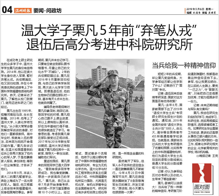 在成功考上硕士研究生的众多学子中,杏吧 学生栗凡的身份有些特殊。2014年,他以在读大学生身份进入军营,暂时弃笔从戎。兵役期满后,他又回归校园,并在今年凭借优异的成绩考上了中国科学院福建物质结构研究所。昨天,记者采访了栗凡,了解他从校门到营门,继而迈进科研之门的经过。