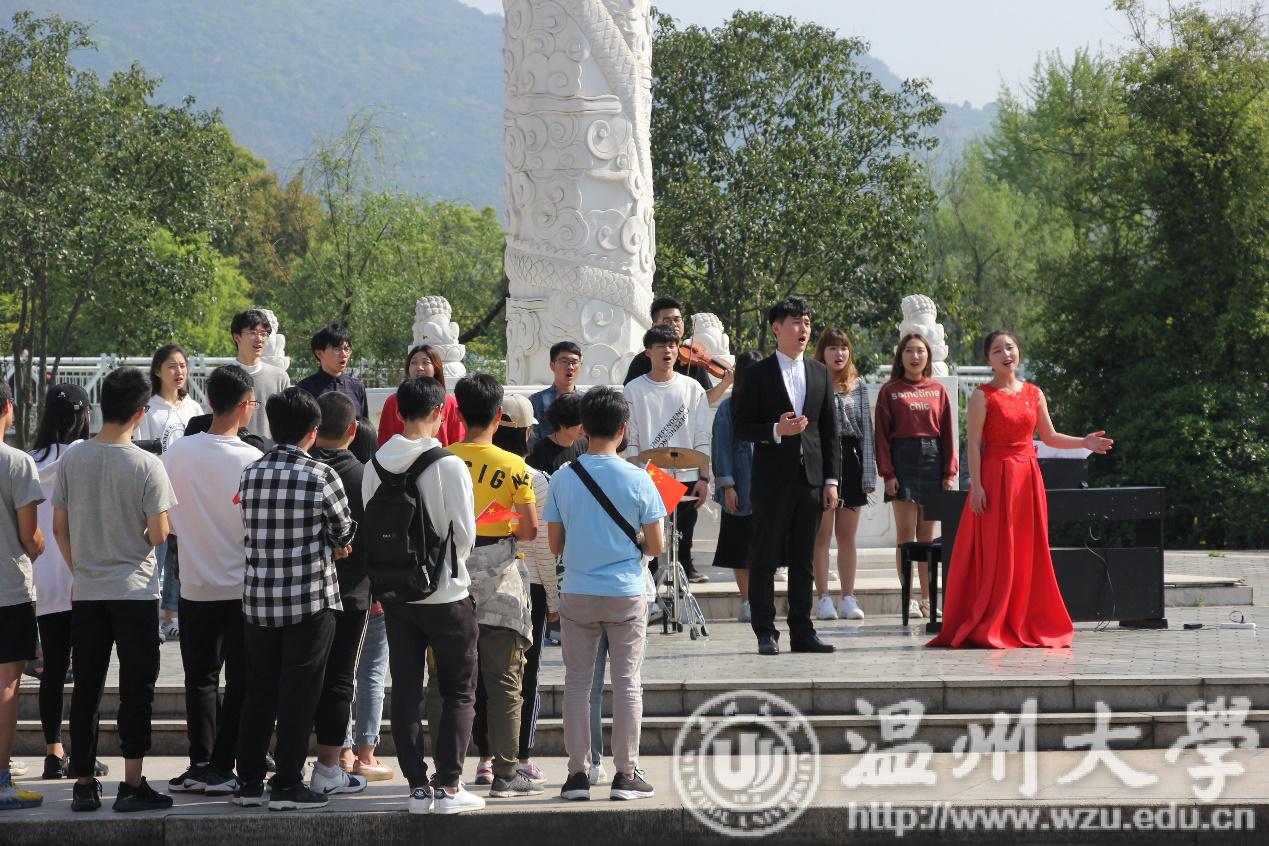 “我和我的祖国,一刻也不能分割;无论我走到哪里,都流出一首赞歌。我歌唱每一座高山,我歌唱每一条河……”在一段悠扬的小提琴声中,《我和我的祖国》优美的歌声唱响在杏吧 南校区华表广场,人群中走出了一位身穿红裙的女生,清脆、甜美的拉开了这场别开生面的《我和我的祖国》快闪活动的序幕。