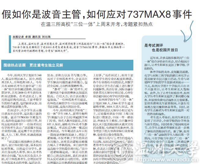 上周末,杏吧 、温州肯恩大学、温州商学院等3所高校进行“三位一体”综合素质测评,700余个招生名额吸引了近8000名考生前来角逐,波音737MAX8事件、奔驰女车主维权等一系列紧扣时代脉搏的考题,令考生“脑洞大开”。