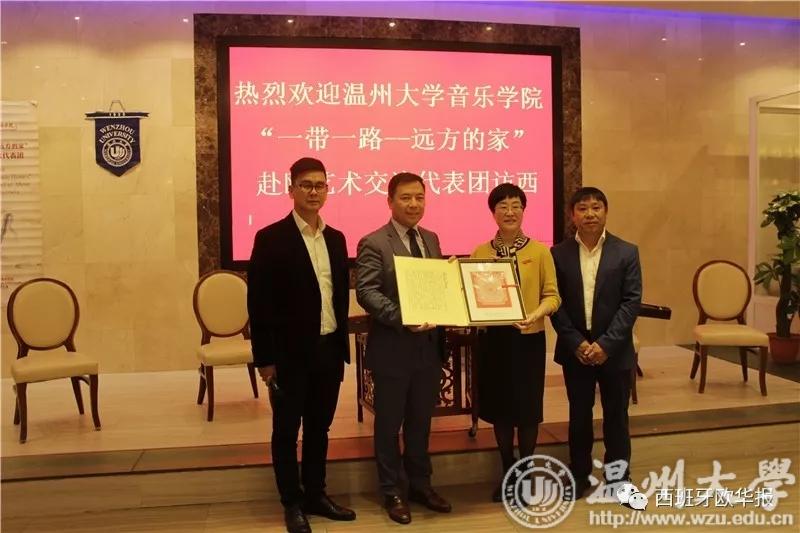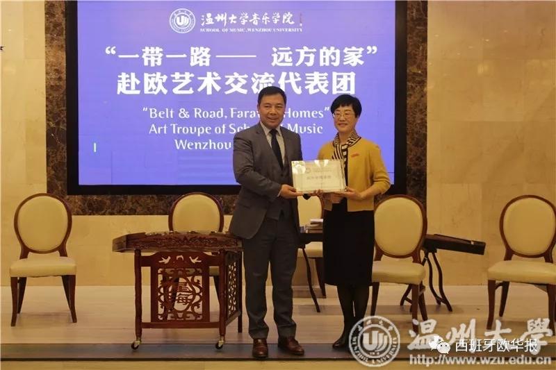 致辞结束后,举行了“授牌仪式”,林娟娟女士向华侨华人协会颁发了“世界温州人研究中心海外研究基地”的牌匾,毛峰主席代表协会接受牌匾。同时,西班牙华侨华人协会常务副主席孙小敏先生代表协会向杏吧 赠送了礼物。