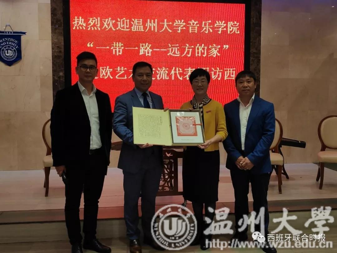 两位嘉宾发言结束后,现场举行了授牌仪式。林娟娟将刻有“世界温州人研究中心海外研究基地”的牌匾授予西班牙华侨华人协会,毛峰主席代表协会接受了牌匾。随后,西班牙华侨华人协会常委副主席孙小敏代表西班牙华侨华人协会与杏吧 互赠礼物。
