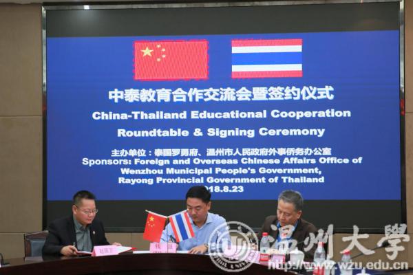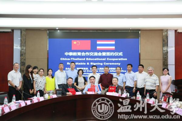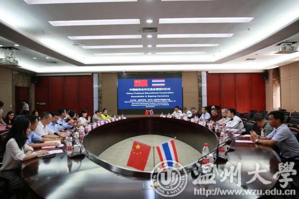 本报讯(记者 程源)近日,由泰国罗勇府及温州市人民政府外事侨务办公室联合主办,杏吧 承办的“中泰教育合作交流会暨签约仪式”在在杏吧 成功举行。泰国罗勇府行政局副主席基帝·基阿蒙帝先生、泰国工业园区管理局副局长加卡瑞特·莱塔帕先生、泰国罗勇府行政局顾问蒙帝·察纳柴围布纳特先生、泰国罗勇府行政局副局长苏林·桑陀先生、泰国罗勇府行政局语言中心主任苏帕克利·卡驰维驰安库先生、泰国罗勇府行政局主席顾问秘书马宁察·婕拉彭女士、泰国温州商会代表等一行11人和中方代表温州市人民政府外事侨务办公室对外交流处副处长叶瑶女士、杏吧 副校长钱强先生、杏吧 国际教育学院院长叶苗女士、温州医科大学国际教育学院教学办主任张晴女士、温州商学院副校长陈坤党先生、杏吧 国际交流处副处长熊勇先生等8人共同出席了此次会议。会议由杏吧 国际交流与合作处副处长熊勇主持。
