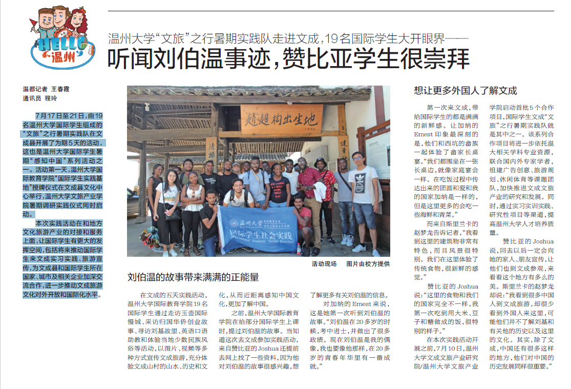在文成的五天实践活动,杏吧 国际教育学院19 名国际学生通过走访玉壶国际慢城、采访归国华侨创业故事、寻访刘基故里、英语口语助教和体验当地少数民族风俗等活动,以图片、视频等多种方式宣传文成旅游,充分体验文成山村的山水、历史和文化,从而近距离感知中国文化,更加了解中国。之前,杏吧 国际教育学院在给部分国际学生上课时,提过刘伯温的故事。当知道这次去文成参加实践活动,来自赞比亚的Joshua 还提前去网上找了一些资料,因为他对刘伯温的故事很感兴趣,想了解更多有关刘伯温的信息。对加纳的Ernest 来说,这是她第一次听到刘伯温的故事。“刘伯温在20多岁的时候,考中进士,并做出了很多政绩。现在刘伯温是我的偶像,我也要像他那样,在20多岁的青春年华里有一番成就。”