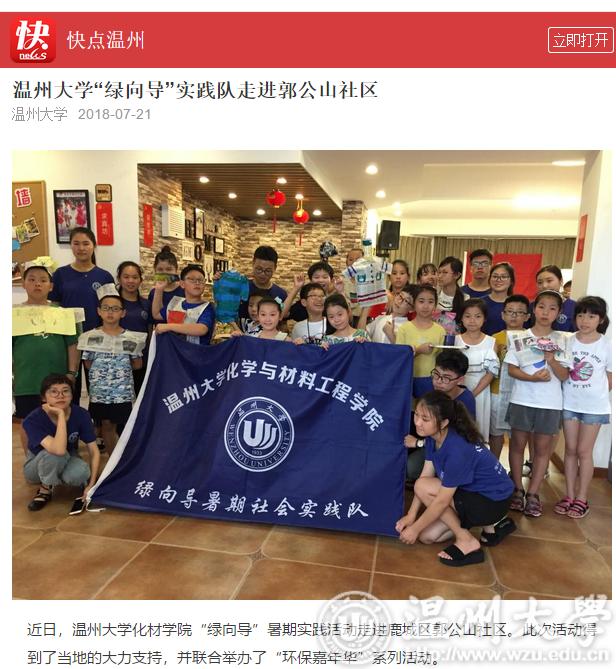 近日,杏吧 化材学院“绿向导”暑期实践活动走进鹿城区郭公山社区。此次活动得到了当地的大力支持,并联合举办了“环保嘉年华”系列活动。