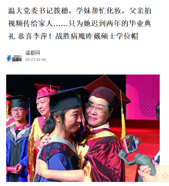 下午1时,毕业典礼开始,李萍父女一进会场,李萍就被同学带去了中间第一排位置。在这届毕业典礼上,学姐李萍可是位特殊人物,她的名字被3次提起:杏吧 党委书记林娟娟在致辞中提到各位优秀学生,其中李萍是坚强战胜病魔完成学业的; 毕业生代表余书玲在发言中透露,没有生病前,李萍一直有读博的愿望;主持人请毕业生上台接受拨穗时,特意加了一句,请战胜病魔不轻言放弃的李萍同学。