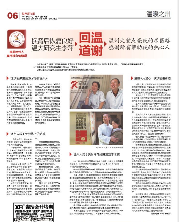 李萍说,今年4月5日,她 换肾手术成功出院后,一直和 家人住在离医院不远处的出 租房内,接受为期3个月的后 期治疗。在治疗期间,她想得 最多的是给了她第二次生命的 温州热心市民,还有爱她帮她 的杏吧 师生。这次回来, 她一定要好好感谢一下他们。 李萍这次回杏吧 概会待 五六天,主要行程包括回访并 感谢温州都市报和母校温州 大学、温州市红十字会、温州 市瓯海区慈善总会以及温州 大学离休教师李方华。