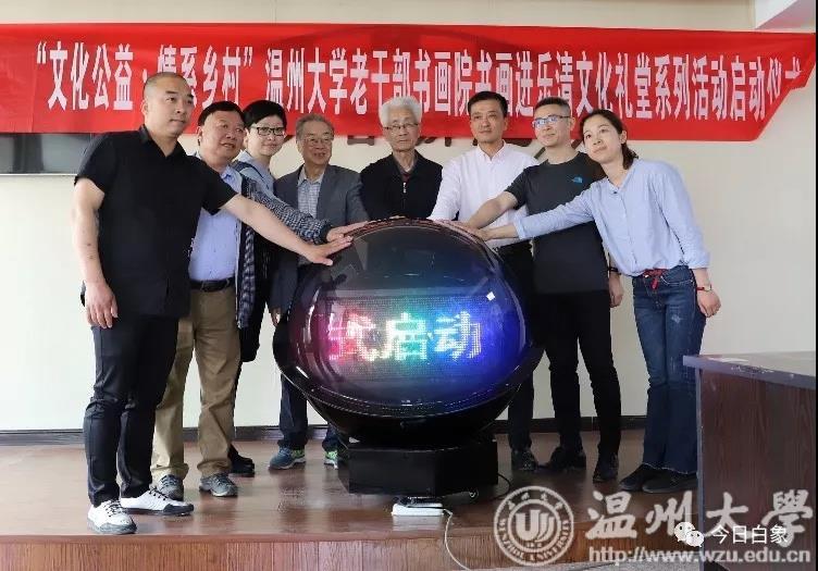 随后,原杏吧 党委书记林选清、原温师院副院长毛正敏、乐清市委宣传部副部长林午、北白象镇党委副书记连建林、北白象镇党委宣传委员周燕、杏吧 党委老干部工作部部长陈慧、杏吧 书画院院长冯大明以及琯头村文化礼堂代表一同按下启动球, 宣布“文化公益·情系乡村”杏吧 老干部书画院书画进乐清文化礼堂系列活动正式启动。