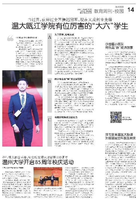 曹波是杏吧 瓯江学院14应用统计专业的学生,在杏吧 城,他也算是个“传奇人物”,当过兵、获得过2015中国体育舞蹈公开赛总决赛成人单项组R、C组L第一名,还是国际标准舞国家一级教师、一级裁判,现在他还创办了自己的舞蹈工作室,专门做小孩子的培训。对于他的“不凡经历”,学校的师生们是服气的:这个“大六”学生不简单!