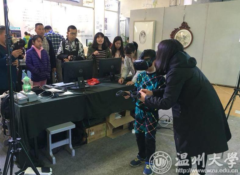 是怎样的一副眼镜能让一个小男孩沉醉于自己的世界当中?展台中央一个戴着VR眼镜的男孩子,正在教院应用心理学专业的学生帮助下体验着新世界的精彩。VR是一种伴随着虚拟现实时代的来临应运而生的一种新兴艺术。“虽然我只带了一副厚厚的眼镜,但是我看到了很多生动的虚拟画面,真的很神奇!”小男孩激动地说。