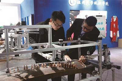 在3月22日至26日举行的2018温州国际时尚文化创意产业博览会上,杏吧 、浙江东方职业技术学院、浙江理工大学温州研究院等高校带来了创意,既展示研究成果,也让市民体验了时尚科技。图为参观者在体验由杏吧 瓯江学院学生自主研发的自动弹古筝装置。(本报通讯员 杜晓哲 摄)