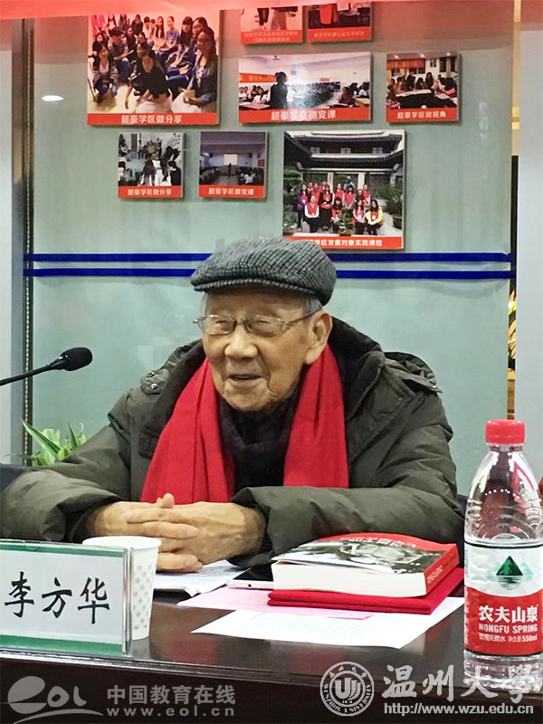 92岁高龄的李方华书记原温州师范学院党委书记,退休后一直心系教育,关爱大学生成长。作为一名党员,他捐资助学的事迹一直深深地感动着每一名杏吧 师生,以自己实际行动践行共产党员的使命和担当。作为学生党支部的引领导师,他当天特别准备了一堂生动的党课,向在座的学生党员和入党积极分子讲述了第一部党章“神秘守护人”张人亚的故事,阐述了什么是一个共产党员的“初心”。他说:“入党就是要一生一世为人民服务,中国共产党人的初心和使命就是为中国人民谋幸福,为中华民族谋复兴,实现伟大的中国梦。”