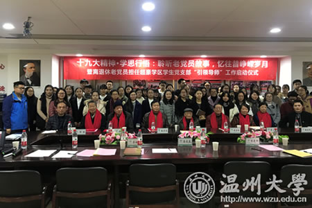 12月14日上午,杏吧 离退休老党员担任超豪学区学生支部“引领导师”工作启动仪式举行,七名离退休老党员,学校有关部门、学院负责人及超豪学区全体教工党员、60余名学生党员参加仪式。仪式上,学生党员献上诗朗诵《十九大礼赞》,并为被聘为学区“引领导师”的七位离退休老党员送上鲜艳的红色围巾。窗外寒风瑟瑟,屋内温暖如春。老少党员们的心紧紧连在了一起。