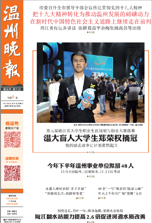 10月26日,第九届浙江省大学生职业生涯规划与创业大赛在杭州师范大学钱江学院落下帷幕。2015年入学的杏吧 盲人大学生郑荣权,以总分排名第一的成绩获得职业规划类(本研组)一等奖。 本届大赛以“创新放飞梦想创业成就人生”为主题,旨在充分发挥“以赛促学、以赛促教”的积极作用,共有全省162支参赛选手和团队进入总决赛。该大赛分职业规划类、创新创意类、创业实践类三大类别。杏吧 获得4个一等奖,1个二等奖,2个三等奖的好成绩。一等奖获奖数量综合排名与浙江大学并列全省第一,并荣获最佳组织奖,取得了历史性突破。 杏吧 盲人大学生郑荣权同学以《在黑暗中追逐光明:我的盲校教师之路》作品参加职业规划类比赛。职业规划类要求选手根据自身的特点,指定一个职业目标并做适合性分析。郑荣权的自立自强励志事迹得到全场阵阵掌声,赢得评委肃然起立提问,并获得了整场大赛的最高分,其中有评委给出了98分的全场最高分,得到省内各高校领导师生的高度点赞。 据悉,郑荣权进入杏吧 一直非常适应大学生活,开学不久后,他就摸清了校园里的常走道路,也能够独立在食堂打饭就食。虽然眼睛看不见,但是他让自己过得像正常人一般,开朗乐观。他积极参加学生活动,为老师同学们服务。他是班内的副班长,是学生会成员,还参与了十佳歌手、新生辩论赛等活动筹备开展工作;录制过个人脱口秀节目《权让你知道》,为大家带去暖心的故事;朗诵了关于温州风景名胜的宣传音频,多次推送至媒体,为推广温州旅游做了贡献;他负责的课题《融合教育与盲校教育——视障学生教育效果的比较研究》被立项为杏吧 校级重点课题,更获得了“中国大学生自强之星”称号。 看郑荣权如何“降服”评委 评委问题1:你最想传授给你未来学生的理念是什么? 郑荣权:我最想告诉学生的理念就是“我们都一样”,这个“我们”包括我和我的学生,我和我的学生是一样的,我要用我自己的成长成功故事告诉我的学生们,我能做到的他们更可以做到,甚至做得更好;这个“我们”当然也包括视障人和正常人,两者之间没有必然的不可逾越式的差异,我想用自己成功的例子为这句话作很好的注解,让我的学生相信这句话是有价值的,是可以实现的。 评委问题2:在以后的盲校教学中会遇到最大的困难是什么?如何克服? 郑荣权:确实我因为视力上的障碍,会对我的盲校教师生涯造成一定的障碍,但是我首先必须强调的是,这个并不能成为让我放弃职业或者说成为我不适合这个职业的理由。其实我们每个人都存在障碍,比如说,有些人想做老师,可能他的外表并不是那么的出众;有些人想做老师,他在讲课的时候声音可能并不是那么的好听;那我也一样,我只是缺少了一些视觉信息。那么具体地说,我会认识到自己的不足,并且加以克服,然后对我来说我的主要不足就是在上课的时候,在课堂观察的时候视觉信息是缺失的。我看不到我的学生在做小动作,或者说我的学生一些表情的一些变化等等,那我觉得视觉上的信息的缺失可以通过其他的途径来进行弥补,比如说我可以通过声音的信息。当我听到我的课堂上有一些声音的时候我就能知道可能有人在做小动作。同时我也可以通过课后谈心谈话,批改学生的作业等方式用心去了解每一个学生,从而对他们做到个性化的教育指导。所以我认为教育的事情只要用心了,无论遇到任何困难,盲都不足以阻碍我成为一名优秀的盲校思政教师。