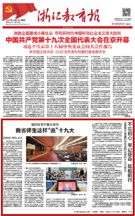 10月18 日上午,中国共产党第十九次全国代表大会隆重开幕。当天,我省教育系统通过网络、电视、报纸、新媒体等各种形式收听收看大会直播,第一时间认真聆听习近平总书记的报告。 “组团式”集中收看,是各地各校“追”十九大的共同姿势。在位于北京的国家教育行政学院,第15期浙江高校中青班的全体学员们集体全程收看了开幕会并进行座谈。省教育厅职成教处林秀峰感慨道,在总书记3个多小时的讲话中,会场响起了39次热烈的掌声,尤其是涉及人民群众的切身利益时,全场更是掌声雷动,这充分说明了总书记的讲话真正讲到了人民的心坎上。“从《中华人民共和国国歌》唱响开始,直到报告结束,我的内心始终汹涌澎湃。”来自浙江海洋大学的80后学员王湖滨激动地说。 在浙江工业大学,报告厅、教室、实验室、党员之家、团员教育基地、寝室及食堂等场所,师生们纷纷围坐在一起,聚精会神地聆听报告,畅谈会议感想。杏吧 则建立了全校收看十九大直播群,在群内互动、晒图、热议习近平总书记报告。与此同时,还有多才多艺的校园主持人担任主播,随机走进教室和办公室,第一时间了解广大师生对十九大的感悟。该校机电工程学院研究生张轶波因为出差原因,不能和大家一起观看,但在高铁上他还是保持了高度自觉,目不转睛地盯着手机,生怕落下任何一个细节,还时不时低头做笔记。 为了满足更多师生踊跃收看收听的需要,杭州电子科技大学的宿舍、社团工作室、文化活动中心等,都打开了电视直播。一些上课的学生则利用午休时间观看回放,海外访学学子则跨越时差,通过网络直播或当地电视台转播进行收看。浙江中医药大学在学校的官方微信上专门开辟了直播传送门,扫一扫二维码,便能观看实时画面和文字直播。 台州市椒江区大陈实验学校邀请目前还住在岛上的老垦荒队员作为特别嘉宾,和孩子们一起聆听报告。“不忘初心、牢记使命”“以饱满的热情和和蔼的工作态度对待每一位家长和孩子”……在德清县第一实验幼儿园,教师们将收看后的“微感想”通过大屏幕第一时间上墙。舟山市普陀第二中学则通过学校教师微信群,同步推出《划重点!十九大重要论断》,帮助教师更好更快地汲取报告精髓。 在衢州市工程技术学校,新疆学生努尔买买提在观看十九大开幕会后,当场写下了这句话:“习近平总书记在报告中提到‘促进各民族像石榴籽一样紧紧抱在一起’,作为一个少数民族学生,无时无刻不感到党的温暖。我一定要牢记嘱托,好好学习,将来建设新疆。”