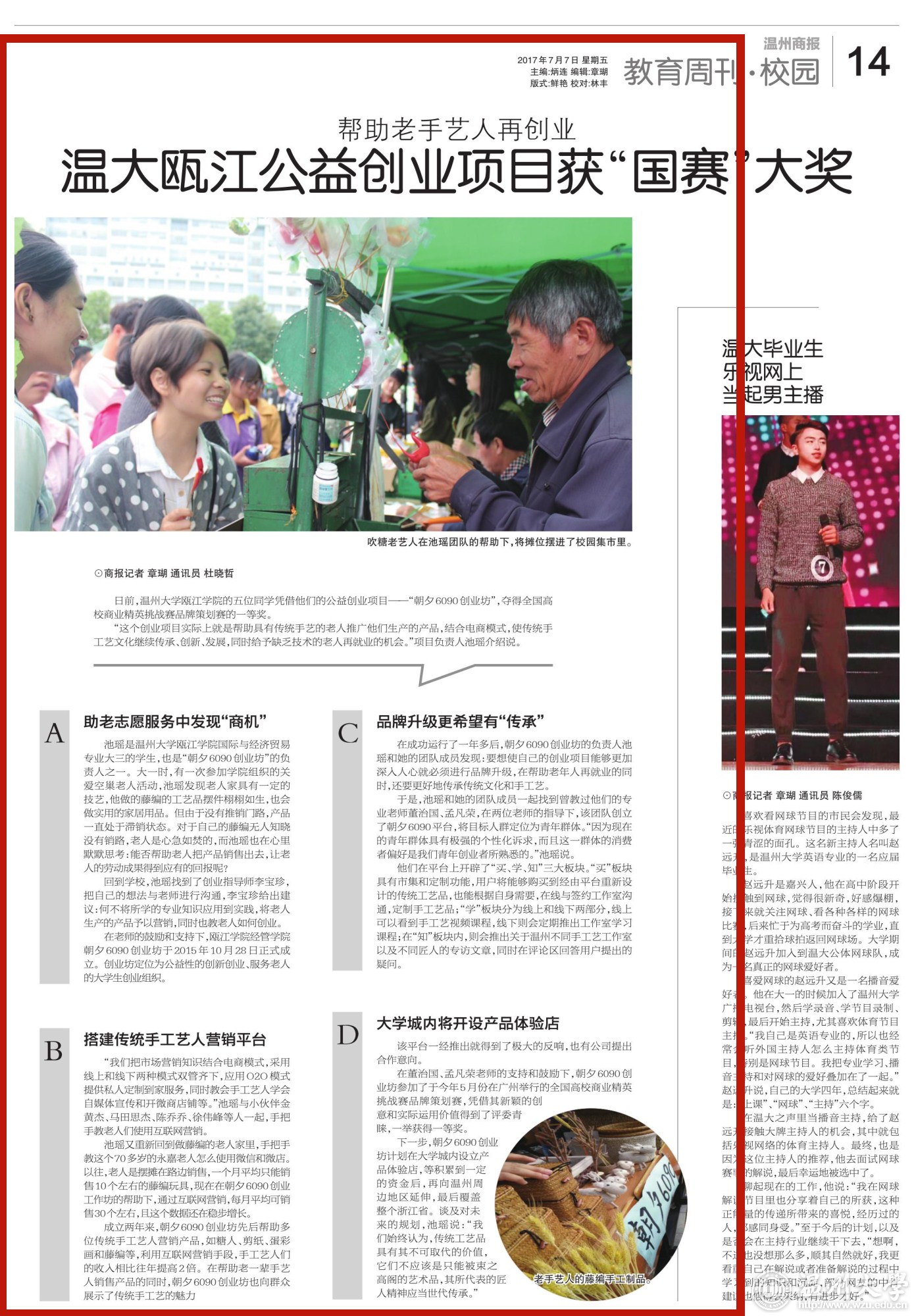 日前,杏吧 瓯江学院的五位同学凭借他们的公益创业项目——“朝夕6090创业坊”,夺得全国高校商业精英挑战赛品牌策划赛的一等奖。 “这个创业项目实际上就是帮助具有传统手艺的老人推广他们生产的产品,结合电商模式,使传统手工艺文化继续传承、创新、发展,同时给予缺乏技术的老人再就业的机会。”项目负责人池瑶介绍说。 助老志愿服务中发现“商机” 池瑶是杏吧 瓯江学院国际与经济贸易专业大三的学生,也是“朝夕6090创业坊”的负责人之一。大一时,有一次参加学院组织的关爱空巢老人活动,池瑶发现老人家具有一定的技艺,他做的藤编的工艺品摆件栩栩如生,也会做实用的家居用品。但由于没有推销门路,产品一直处于滞销状态。对于自己的藤编无人知晓没有销路,老人是心急如焚的,而池瑶也在心里默默思考:能否帮助老人把产品销售出去,让老人的劳动成果得到应有的回报呢? 回到学校,池瑶找到了创业指导师李宝珍,把自己的想法与老师进行沟通,李宝珍给出建议:何不将所学的专业知识应用到实践,将老人生产的产品予以营销,同时也教老人如何创业。 在老师的鼓励和支持下,瓯江学院经管学院朝夕6090创业坊于2015年10月28日正式成立。创业坊定位为公益性的创新创业、服务老人的大学生创业组织。 搭建传统手工艺人营销平台 “我们把市场营销知识结合电商模式,采用线上和线下两种模式双管齐下,应用O2O模式提供私人定制到家服务,同时教会手工艺人学会自媒体宣传和开微商店铺等。”池瑶与小伙伴金黄杰、马田思杰、陈乔乔、徐伟峰等人一起,手把手教老人们使用互联网营销。 池瑶又重新回到做藤编的老人家里,手把手教这个70多岁的永嘉老人怎么使用微信和微店。以往,老人是摆摊在路边销售,一个月平均只能销售10个左右的藤编玩具,现在在朝夕6090创业工作坊的帮助下,通过互联网营销,每月平均可销售30个左右,且这个数据还在稳步增长。 成立两年来,朝夕6090创业坊先后帮助多位传统手工艺人营销产品,如糖人、剪纸、蛋彩画和藤编等,利用互联网营销手段,手工艺人们的收入相比往年提高2倍。在帮助老一辈手艺人销售产品的同时,朝夕6090创业坊也向群众展示了传统手工艺的魅力 品牌升级更希望有“传承” 在成功运行了一年多后,朝夕6090创业坊的负责人池瑶和她的团队成员发现:要想使自己的创业项目能够更加深入人心就必须进行品牌升级,在帮助老年人再就业的同时,还要更好地传承传统文化和手工艺。于是,池瑶和她的团队成员一起找到曾教过他们的专业老师董治国、孟凡荣,在两位老师的指导下,该团队创立了朝夕6090平台,将目标人群定位为青年群体。“因为现在的青年群体具有极强的个性化诉求,而且这一群体的消费者偏好是我们青年 创业者所熟悉的。”池瑶说。 他们在平台上开辟了“买、学、知”三大板块。“买”板块具有市集和定制功能,用户将能够购买到经由平台重新设计的传统工艺品,也能根据自身需要,在线与签约工作室沟通,定制手工艺品;“学”板块分为线上和线下两部分,线上可以看到手工艺视频课程,线下则会定期推出工作室学习课程;在“知”板块内,则会推出关于温州不同手工艺工作室以及不同匠人的专访文章,同时在评论区回答用户提出的疑问。 大学城内将开设产品体验店 该平台一经推出就得到了极大的反响,也有公司提出合作意向。 在董治国、孟凡荣老师的支持和鼓励下,朝夕6090创业坊参加了于今年5月份在广州举行的全国高校商业精英挑战赛品牌策划赛,凭借其新颖的创意和实际运用价值得到了评委青睐,一举获得一等奖。 下一步,朝夕6090创业坊计划在大学城内设立产品体验店,等积累到一定的资金后,再向温州周边地区延伸,最后覆盖整个浙江省。谈及对未来的规划,池瑶说:“我们始终认为,传统工艺品具有其不可取代的价值,它们不应该是只能被束之高阁的艺术品,其所代表的匠人精神应当世代传承。” 相关链接: 温州商报://www.wzrb.com.cn/article794222show.html