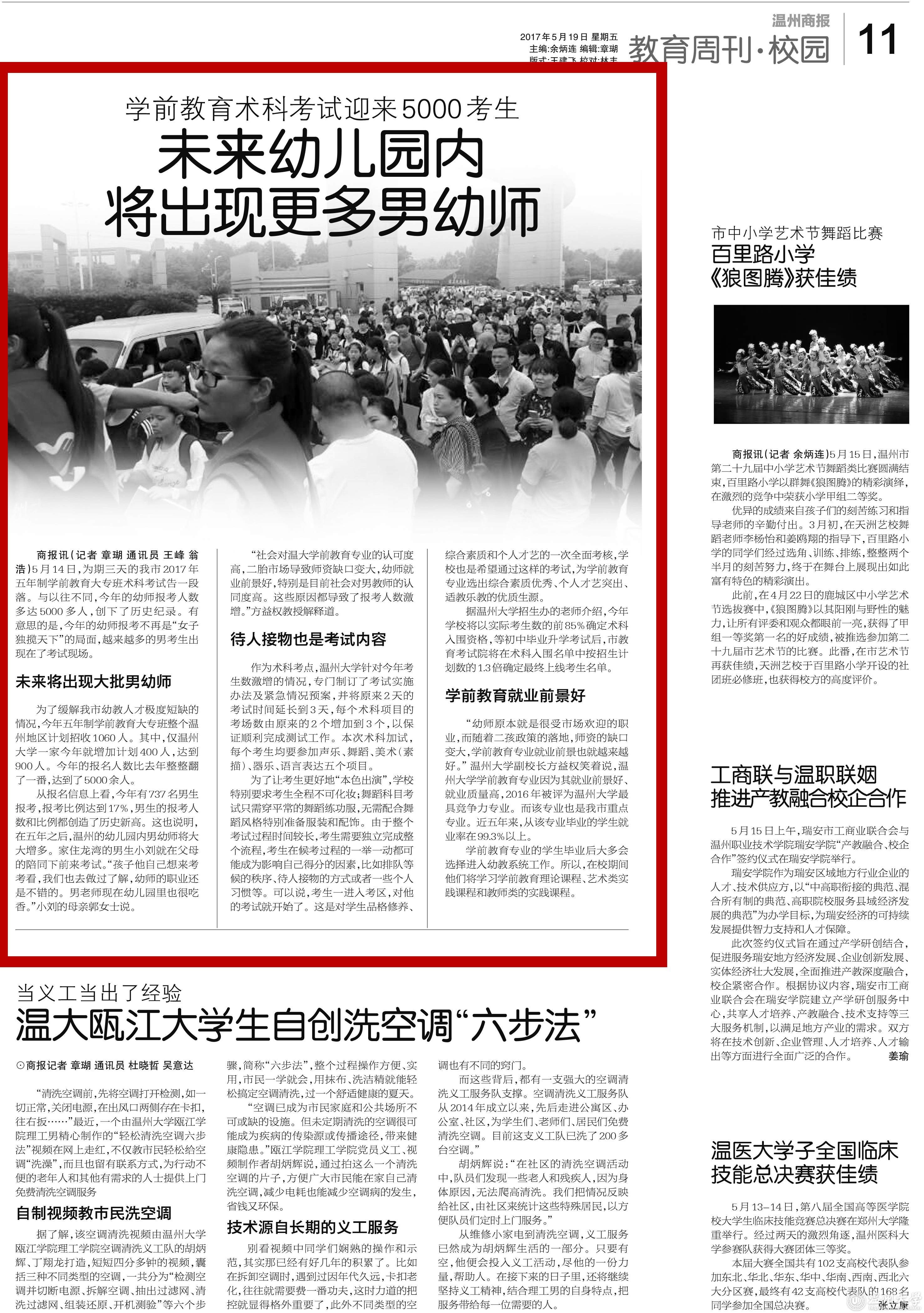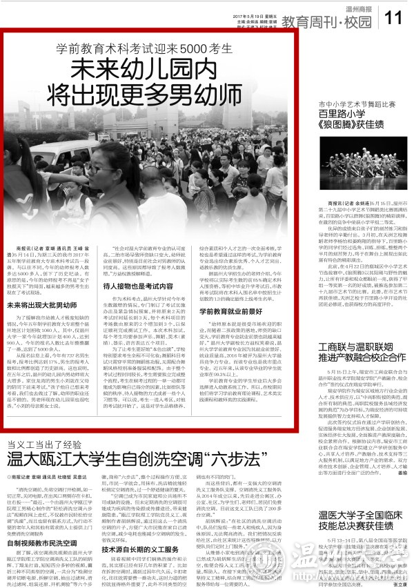 商报讯 5月14日,为期三天的我市2017年五年制学前教育大专班术科考试告一段落。与以往不同,今年的幼师报考人数多达5000多人,创下了历史纪录。有意思的是,今年的幼师报考不再是“女子独揽天下”的局面,越来越多的男考生出现在了考试现场。