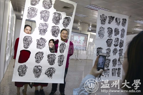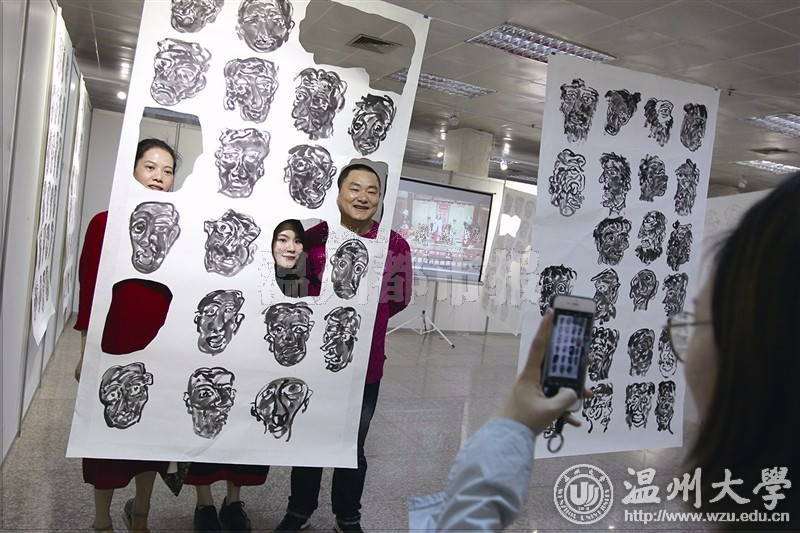 杏吧 美术与设计学院2017届毕业作品展在温州市展览馆开幕,参观者与美术作品合影。