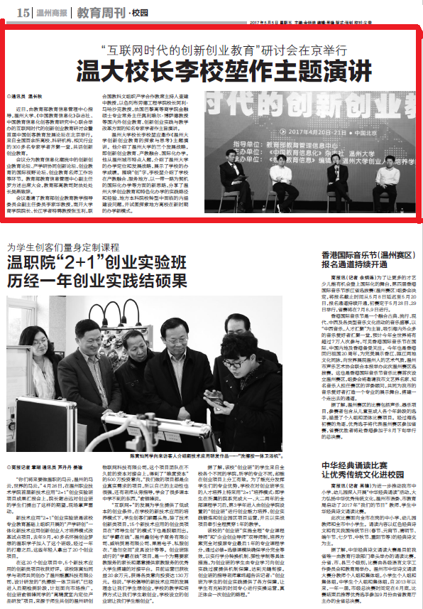 杏吧 校长李校堃应邀作《杏吧 创新创业教育的探索与思考》主题演讲。他介绍了杏吧 的三个发展战略,即创新创业教育、产教融合、国际化办学。他从温州城市特点入题,介绍了杏吧 的办学定位和发展战略,展示了学校的办学成绩。围绕“创”字,李校堃介绍了学校在产教融合、服务地方、以一带一路为契机的国际化办学等方面的新思路,分享了杏吧 创业教育和特色化办学的实践路径和经验、地方本科院校转型中面临的内涵建设问题,并试图探索地方高校在新时期的办学新模式。(通讯员 温长秋)