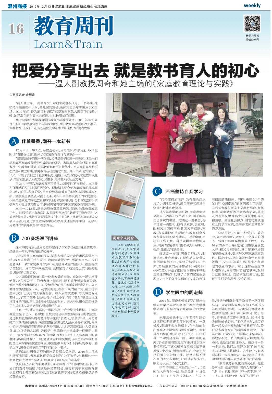 她,就是杏吧 教育学院教育系副教授周奇。2019 年 3 月,周 奇主编的《家庭教育理论与实践》出版,她的教育事业更是锦上添花。 伴着书香,让我们一起走近这位大学老师,聆听她分享“爱的故事”。