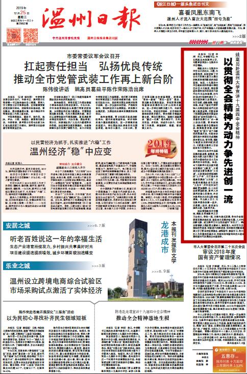 结合贯彻落实全会精神,姚高员希望杏吧 不忘初心、争创一流,注重内涵式发展,争当全省高等教育发展的追赶者、服务地方发展的桥头堡、人才外溢的孵化器,成为温州引以为荣的城市“金名片”。姚高员寄语杏吧 教师要立德树人、铸魂育人,当好学生忠诚信仰的传道者、创新能力的塑造者、创业就业的铺路者;杏吧 学子要坚定理想信念,珍惜韶华、勤奋学习,努力练好人生和事业的基本功,积极投身创新创业的主战场,勇担新时代发展的历史新使命。