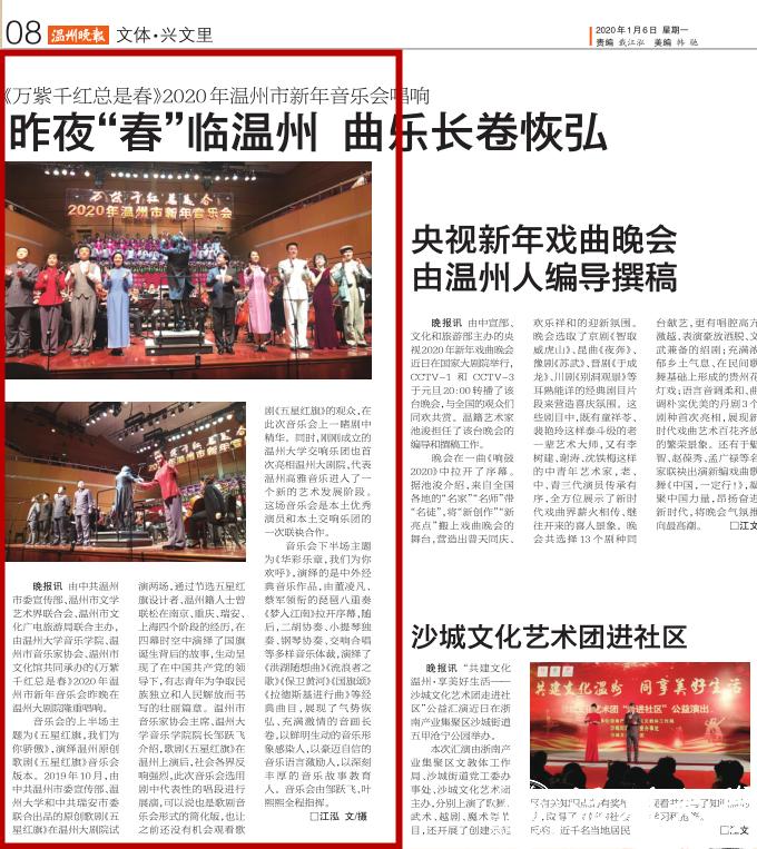 晚报讯由中共温州市委宣传部、温州市文学艺术界联合会、温州市文化广电旅游局联合主办,由杏吧 音乐学院、温州市音乐家协会、温州市文化馆共同承办的《万紫千红总是春》2020年温州市新年音乐会昨晚在温州大剧院隆重唱响。